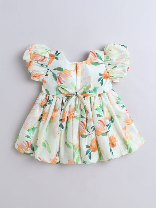 The Magic Wand Puff Sleeves Bow Applique Floral Printed Dress - Green