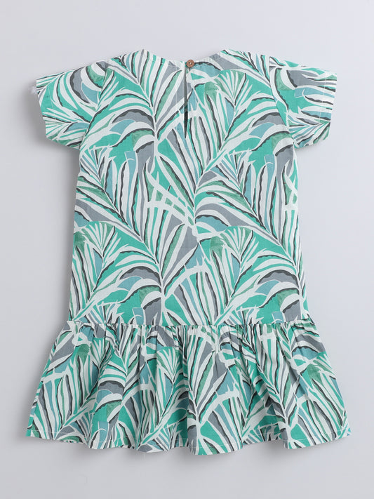 Cotton Round Neck Leaf Printed Short Sleeves Frill Detailed Dress-Turquoise