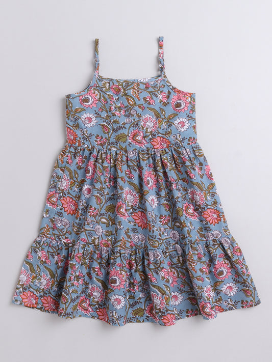 Singlet Floral Printed Cotton Sustainable Sleeveless Strappy Tiered Dress-Grey