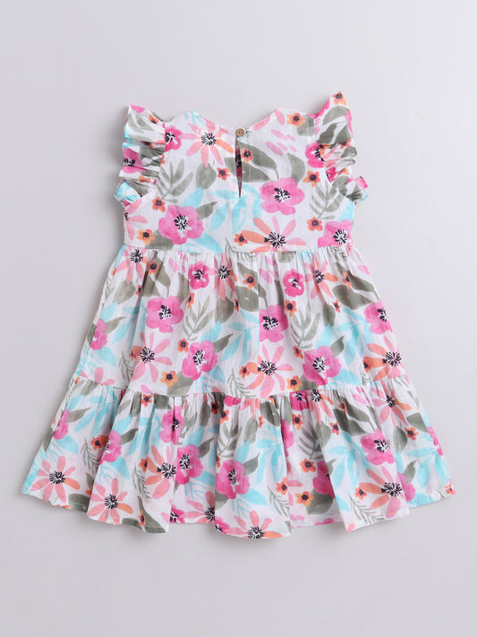 Floral Printed Tiered Dress For Girls With Ruffles at Sleeves-Beige