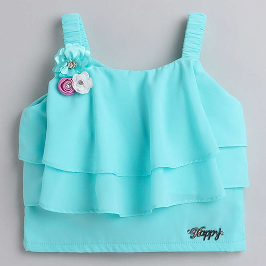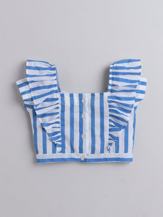 The Magic Wand Frill Detailed Top With Coordinating Stripes Bow Embelished Pant Set For Girls Blue
