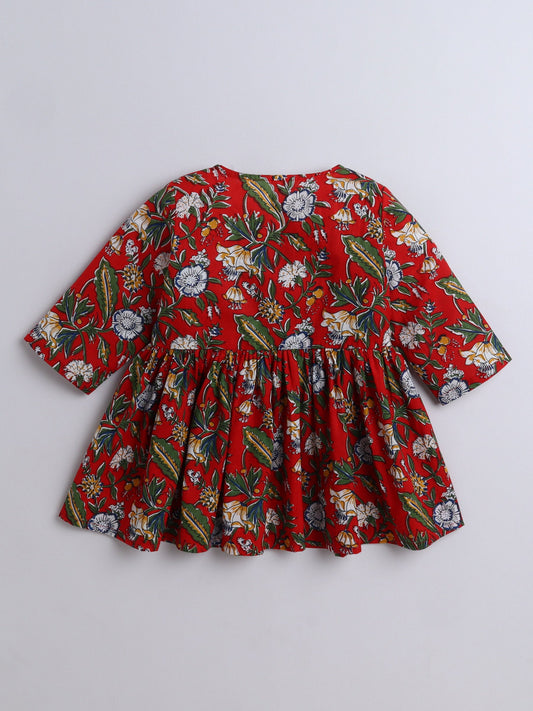 Cotton Three Fourth Sleeves Floral Printed Top & Pant Set-Red