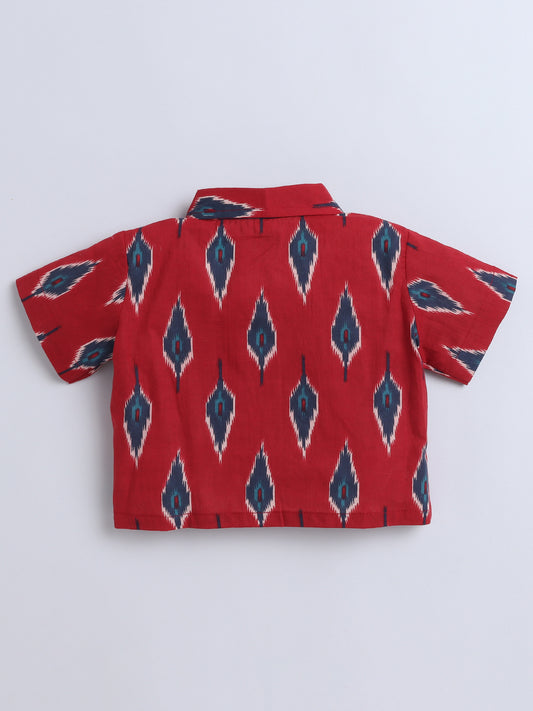 Hand Block Printed Cotton Short Sleeves Tie-up Shirt and Striped Harem Pant Set For Girls-Red