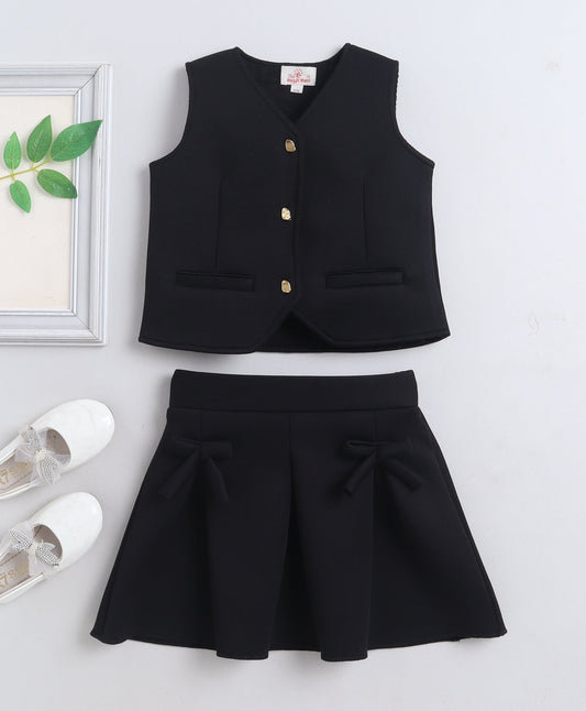 The Magic Wand Woven Waist Coat Top & Pleated Skirt With Bow Applique - Black
