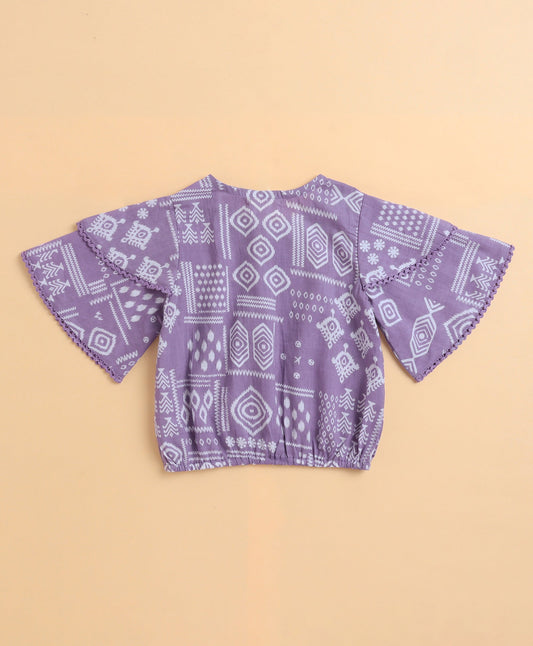 Cambric Cotton Flutter Sleeves Printed Top and Bottom Co-ord Set - Purple