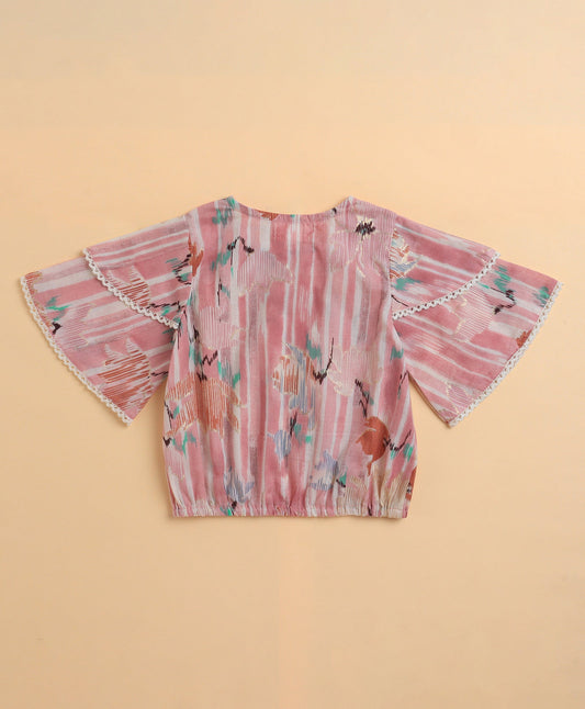 Cambric Cotton Flutter Sleeves Printed Top and Bottom Co-ord Set - Pink