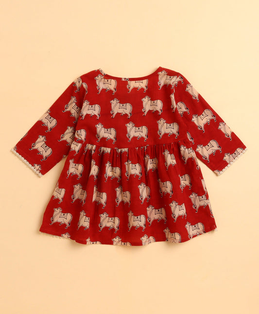 Cambric Cotton 3/4 th Sleeves Cow Printed Kurta and Bottom Set- Red