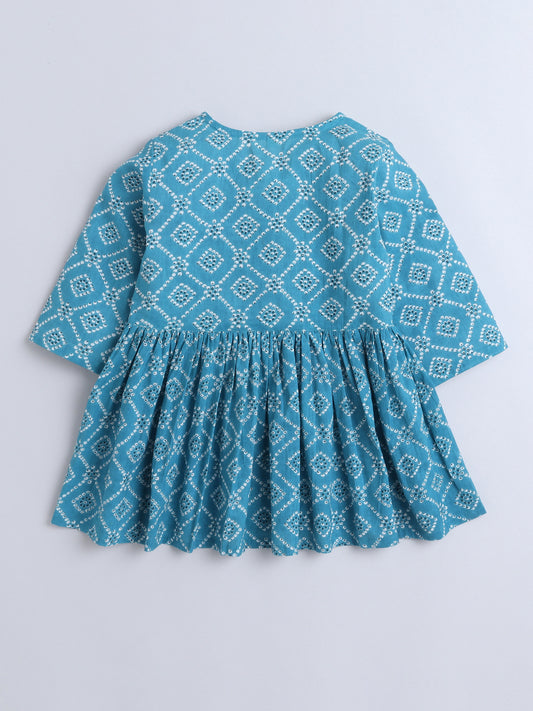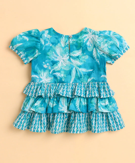 Cotton Woven Abstract Printed Puff Sleeves Top and Bottom Coordinating Set - Teal Blue