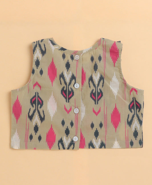 Cotton Sleeveless Ikat Printed Frill with Gota Top and Plazzo Set - Beige