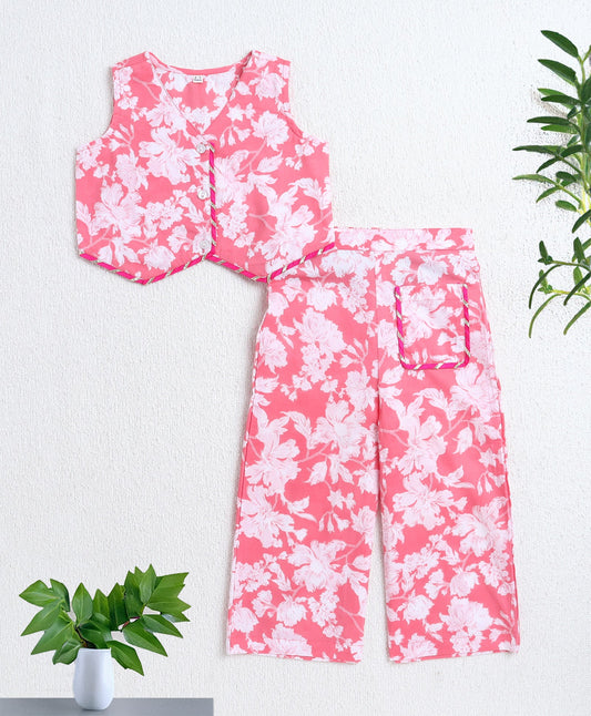 Cotton Woven Sleeveless Floral Printed Top and Patch Pocket Pant Set- Peach
