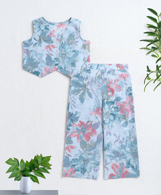 Cotton Woven Sleeveless Floral Printed Top and Patch Pocket Pant Set- Blue