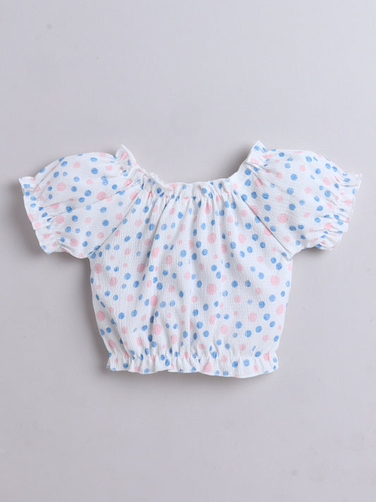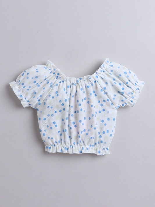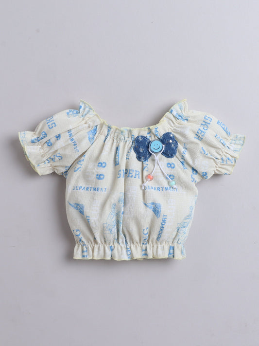 All Over Printed Puff Sleeves Bow Detail Top & Skirt Set - White