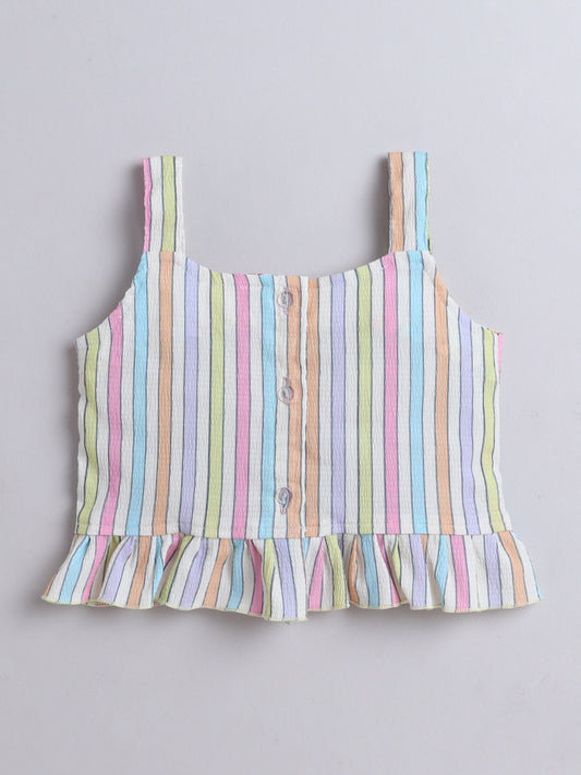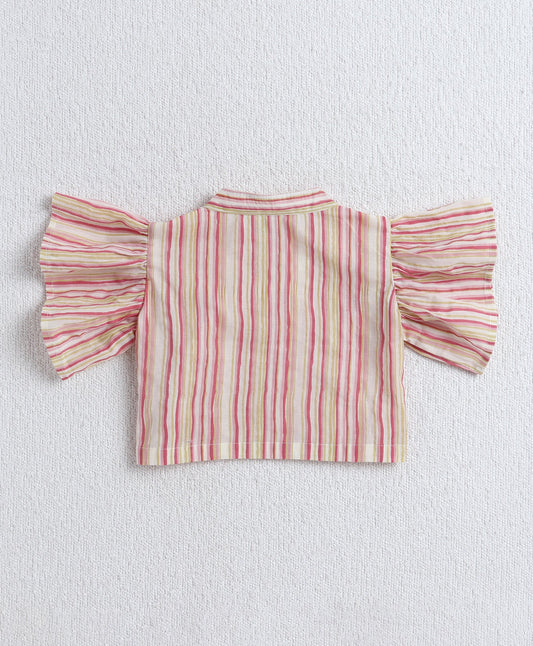 Cotton Woven Frill Sleeves Stripe Printed Top with Patch Pocket Pant Set- Peach