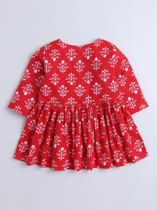 3/4th Sleeves Cotton Floral Printed Gathered Top & Pant Set -Red