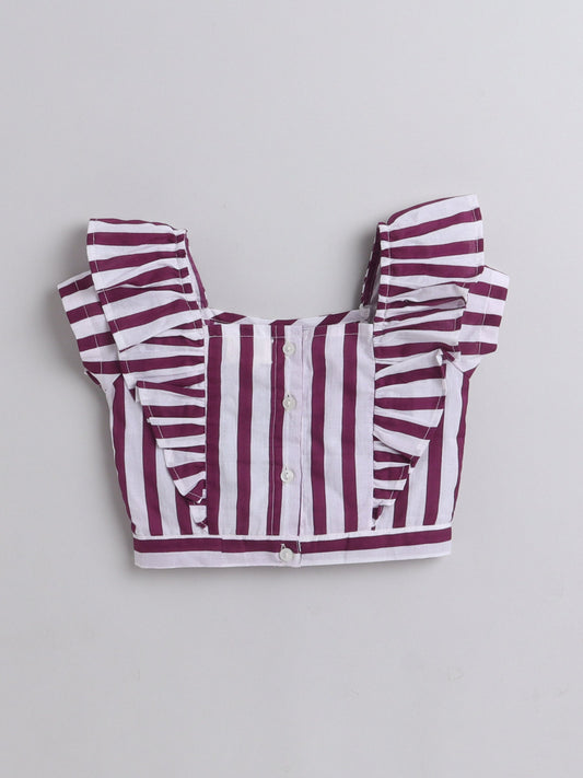 Cap Sleeves Frill Detailed Candy Striped Top With Bow Embellished Coordinating Pant - White & Purple