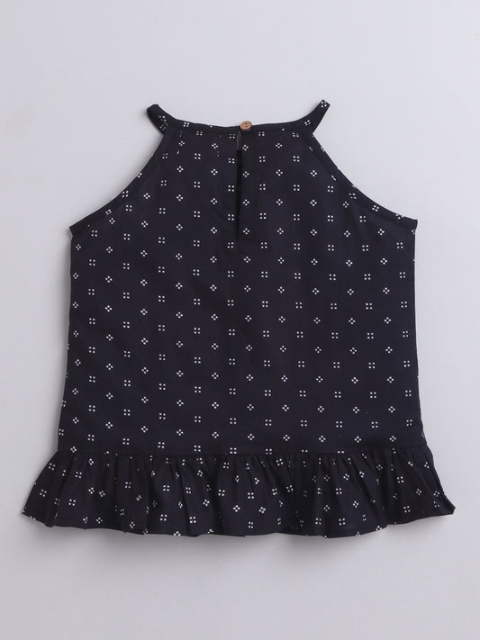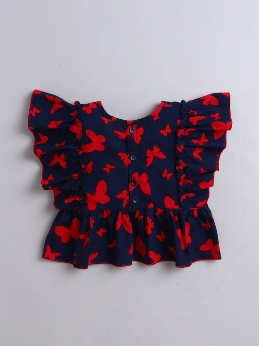 Butterfly Printed Cotton Frill Top - Navy Blue