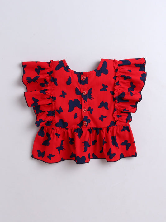 Cotton Butterfly Printed Frill Top - Red