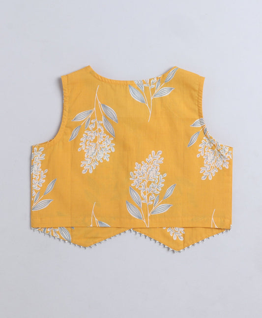 Cotton Woven Sleeveless Floral Printed Waist Coat Top- Mustard