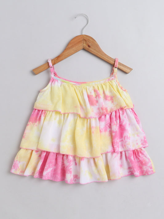 Tie & Dye Printed Rayon Sleeveless Tiered Tops - Pink, Yellow
