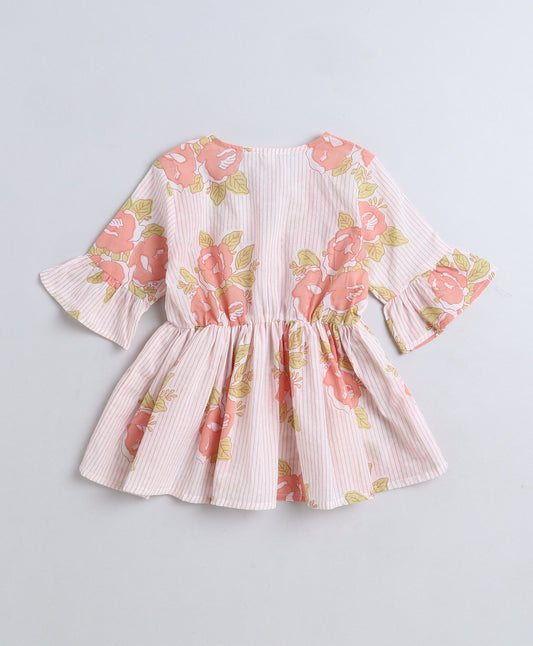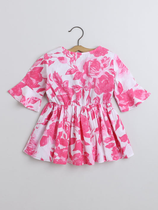 Floral Printed Cotton Three Fourth Sleeves Gathered Round Neck Top with Tassel -Pink