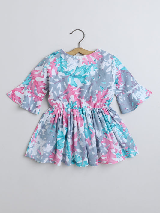 Leaf Printed Cotton Three Fouth Sleeves Gathered Top with Tassels - Blue