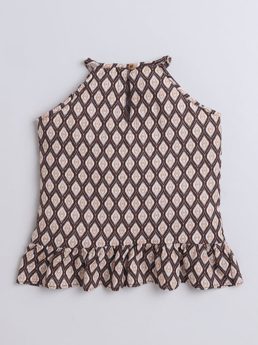 Rayon Ikat Printed Cotton Frill Detailed Incut Top - Brown