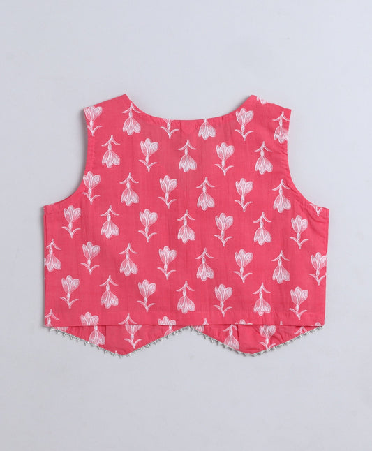 Cotton Woven Sleeveless Floral Printed Waist Coat Top- Peach