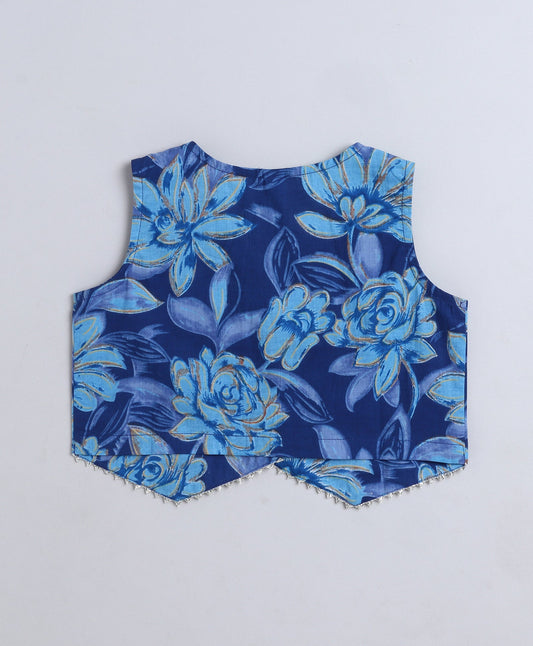 Cotton Woven Sleeveless Floral Printed Waist Coat Top-Blue