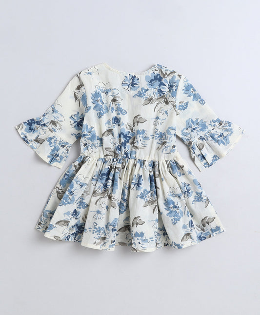 Cotton Woven Three Fourth Sleeves Floral Printed Top- Off White