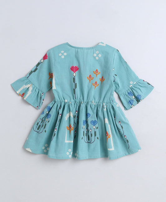 Cotton Woven Three Fourth Sleeves Floral Printed Top-Teal