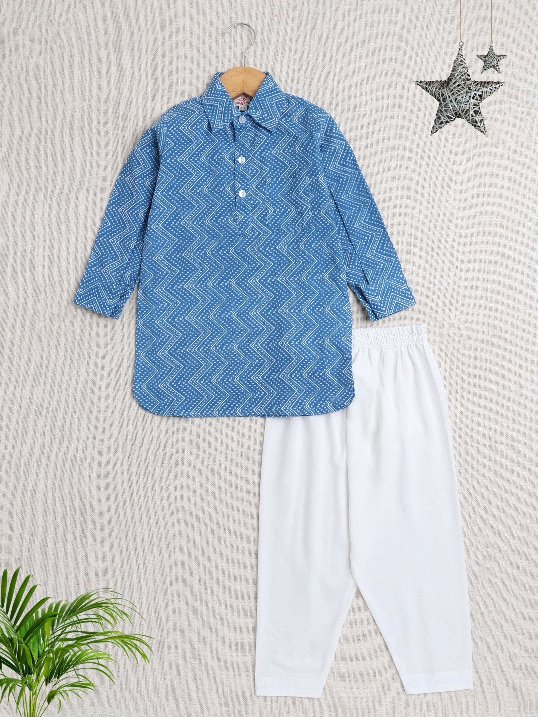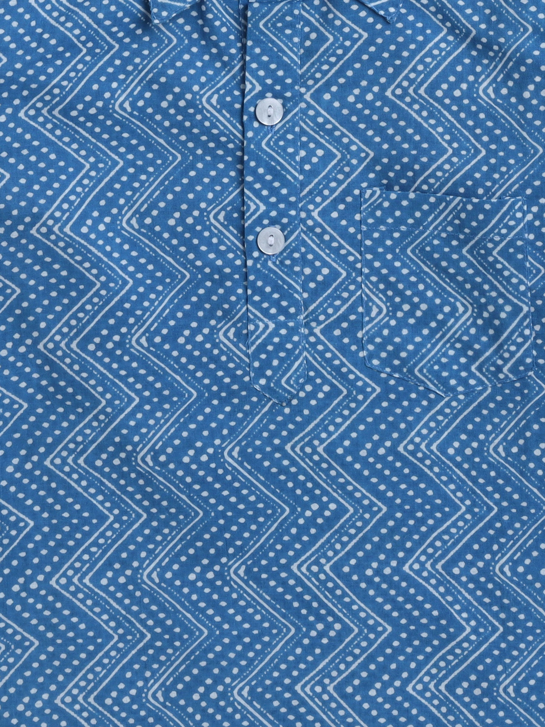 Cotton Full Sleeves Chevron Printed Pathani Kurta With Pyjama Set - Blue