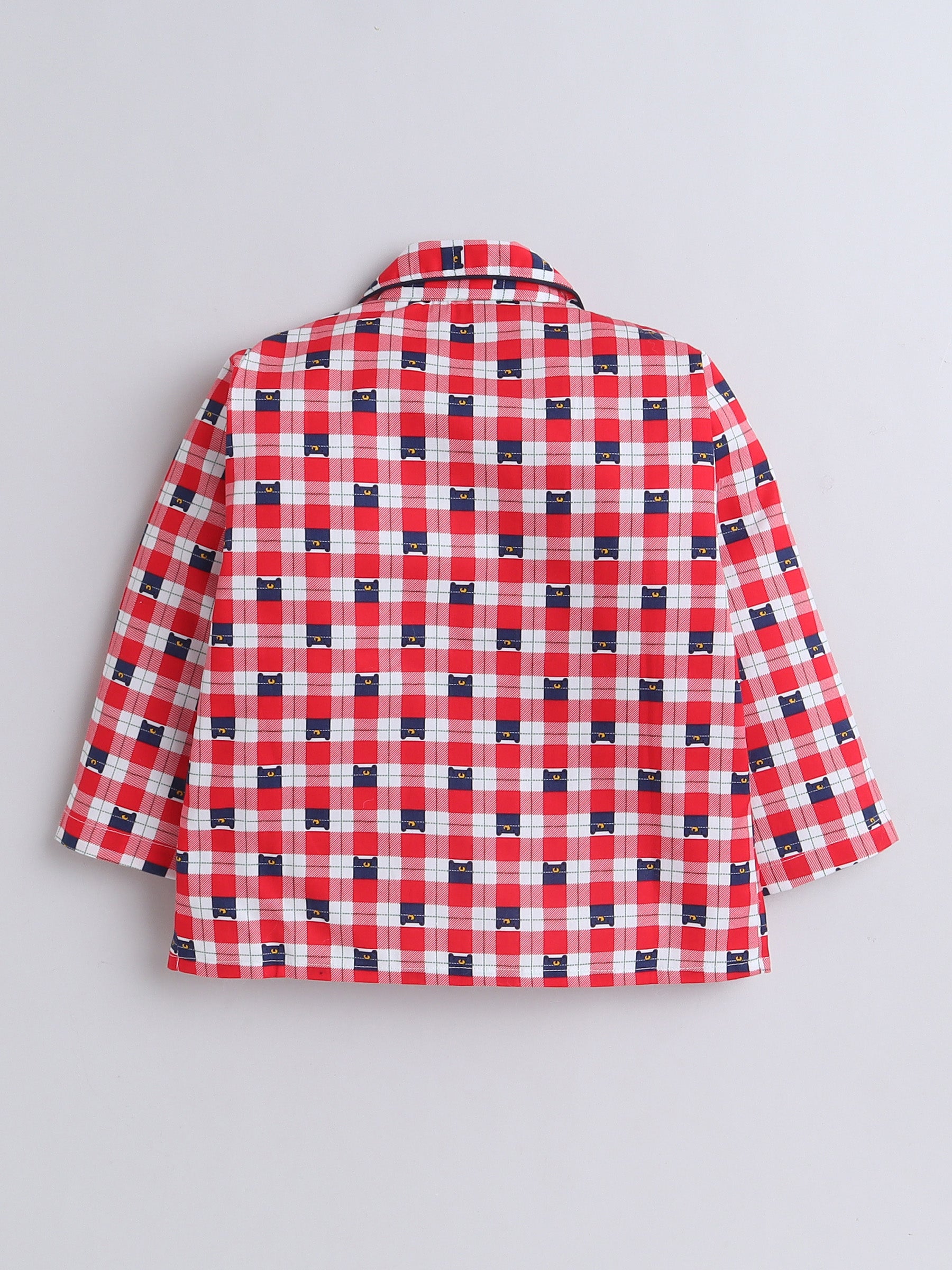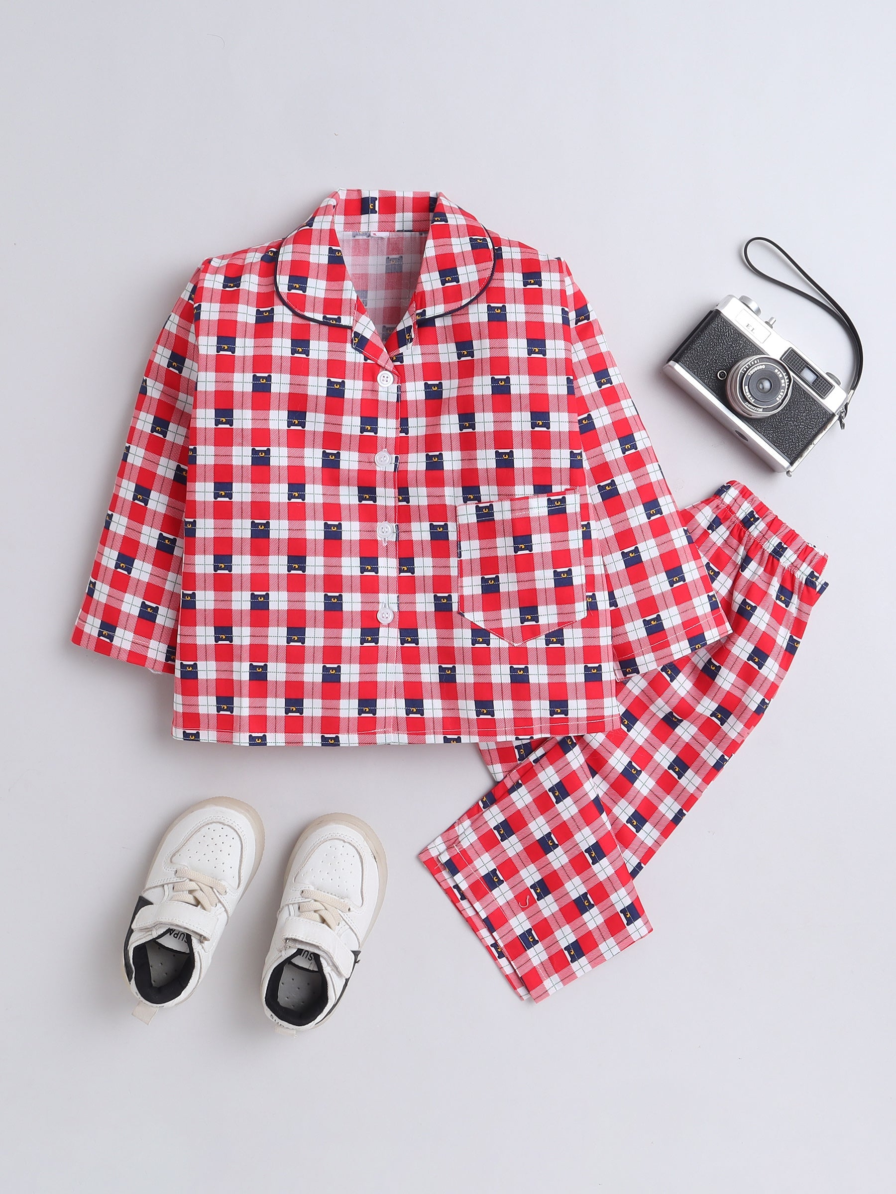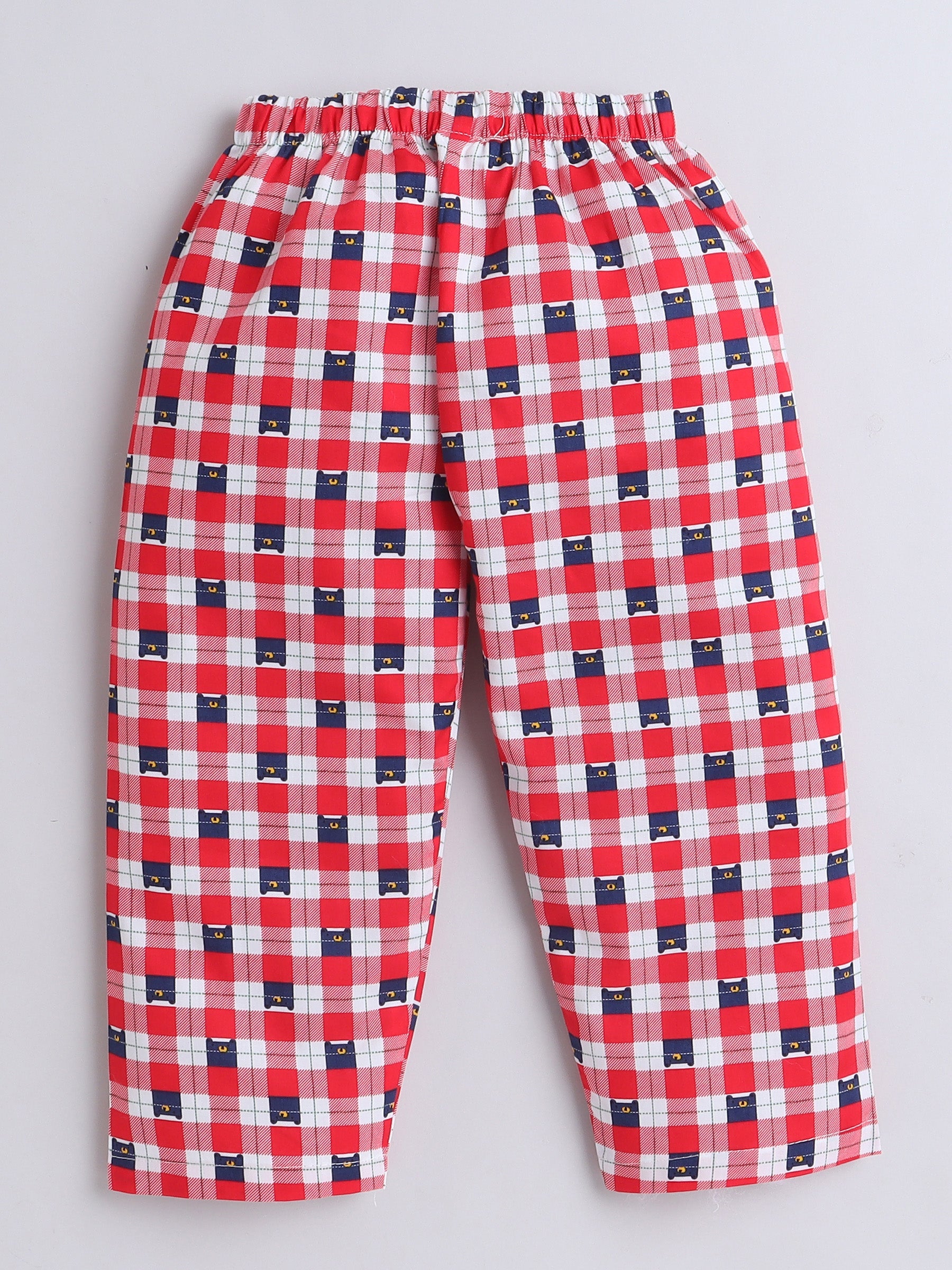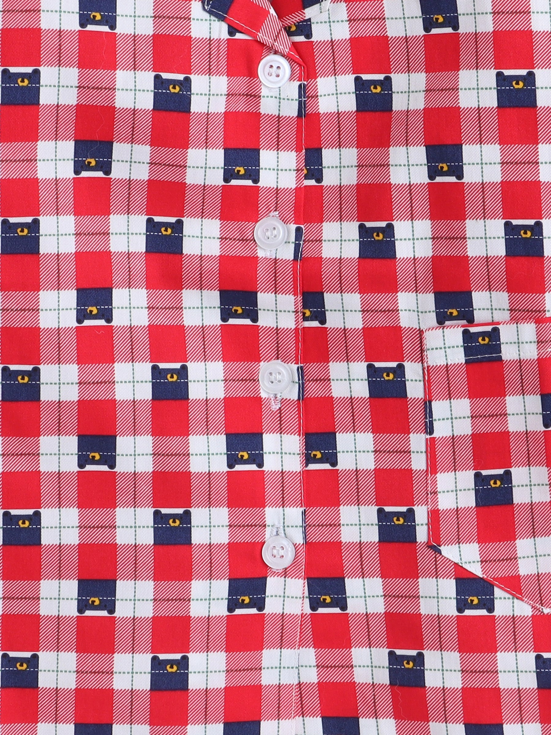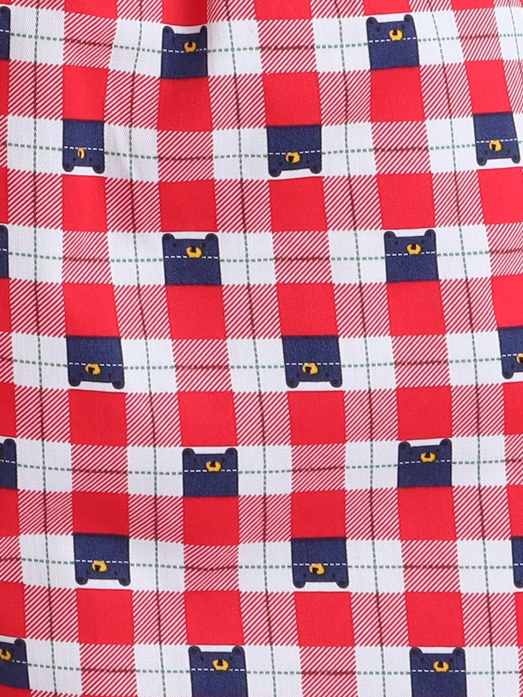 Cotton Woven Full Sleeves Bear Printed & Checked Coordinating Night Suit Set - Red