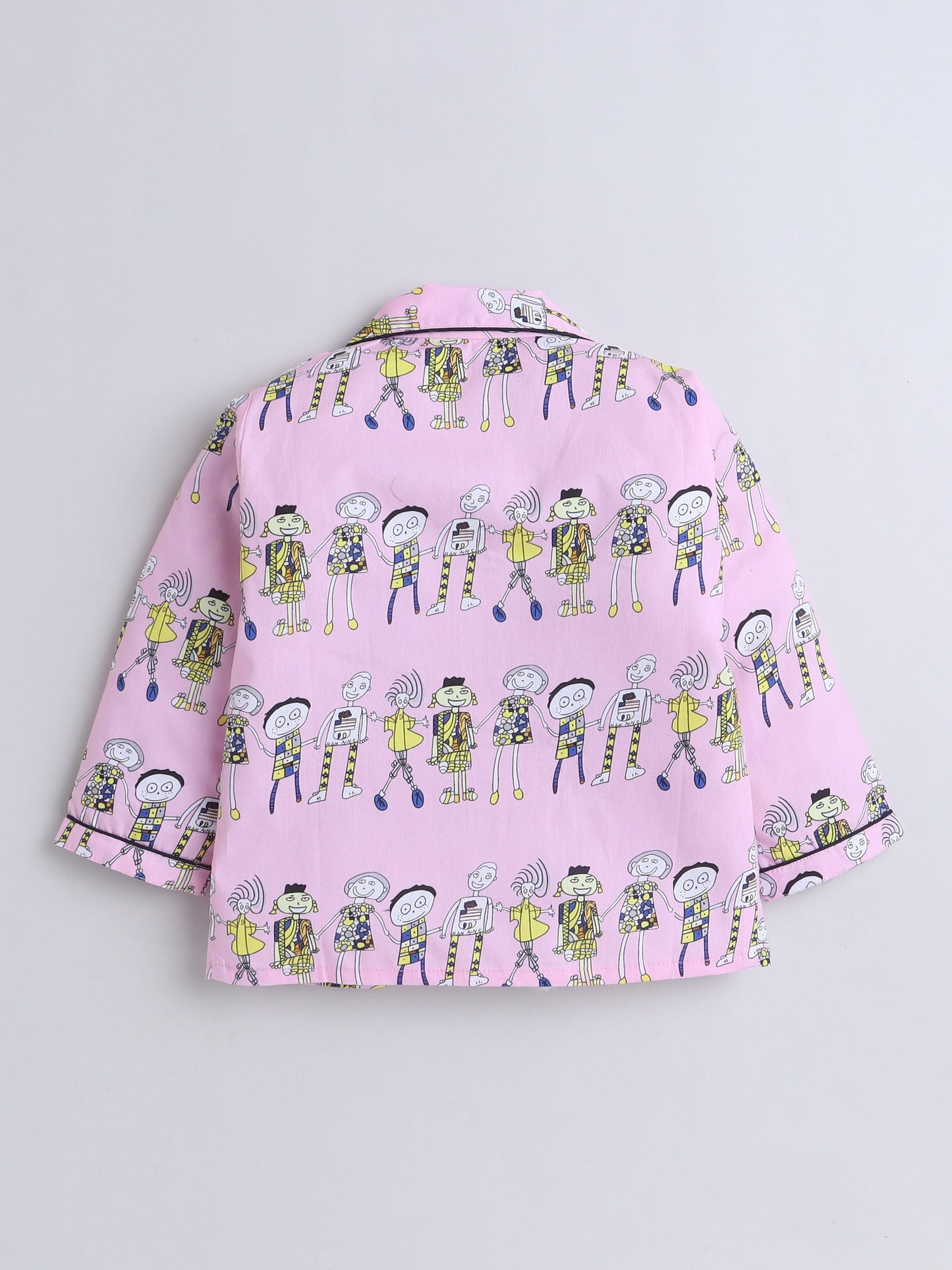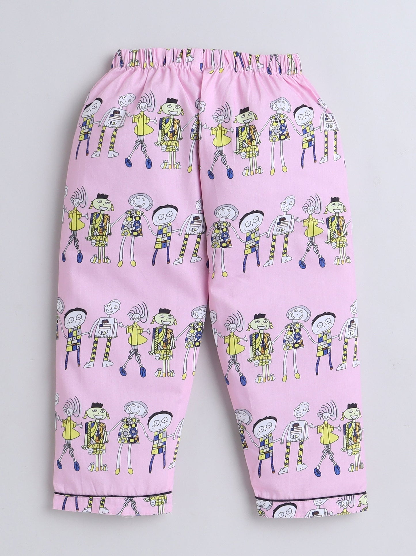 Cotton Woven Full Sleeves Humans Printed Coordinating Night Suit Set - Pink