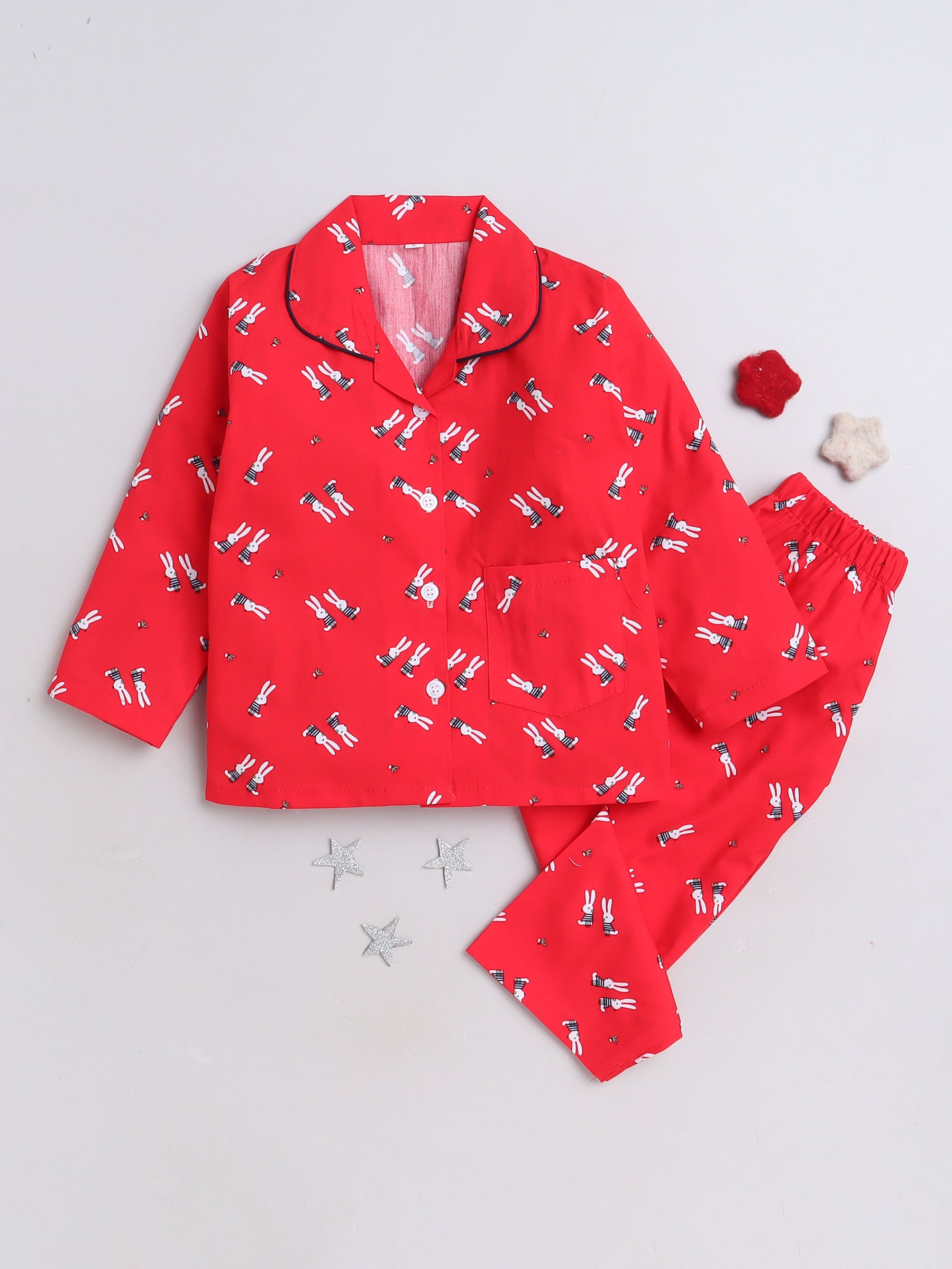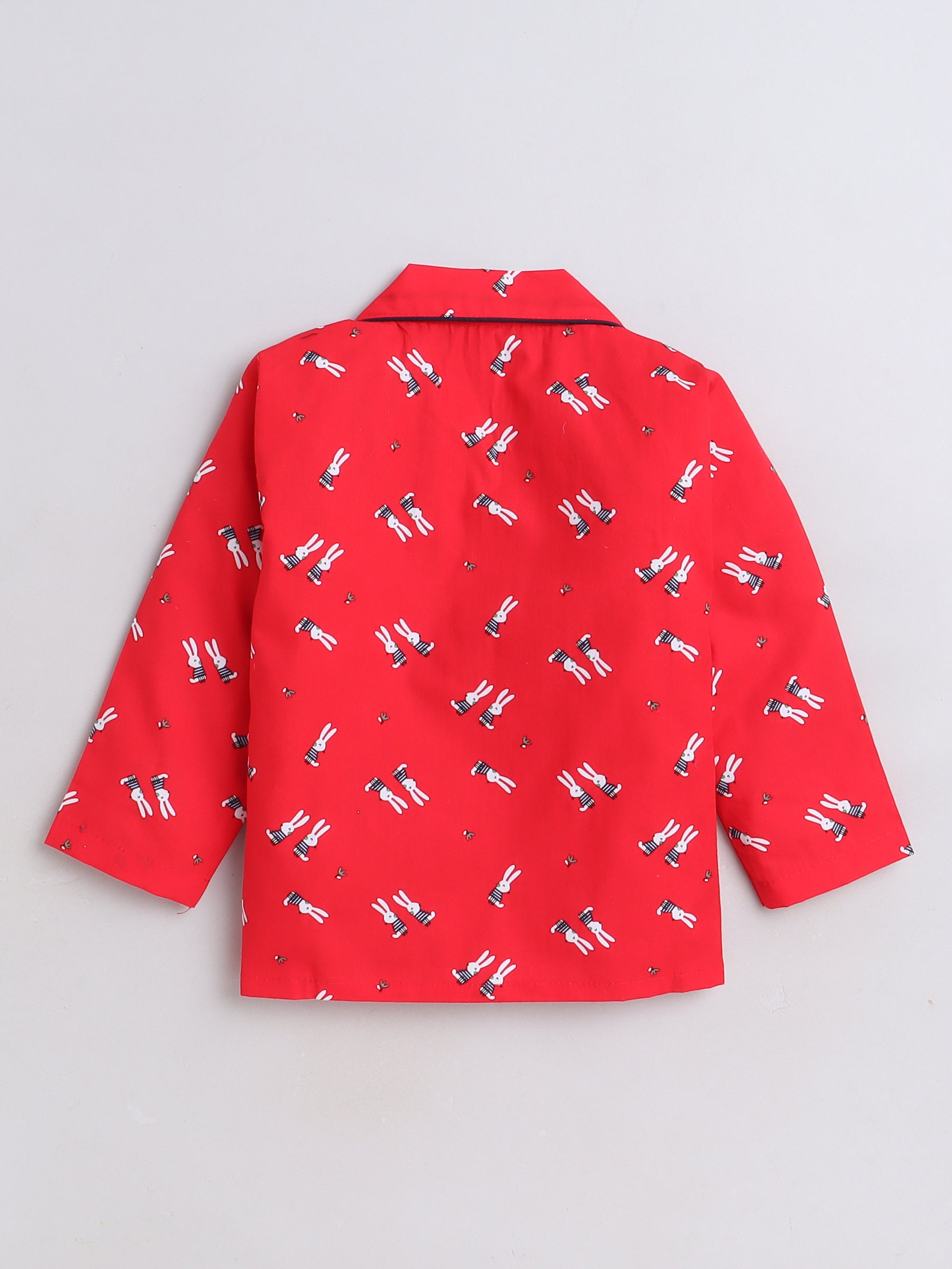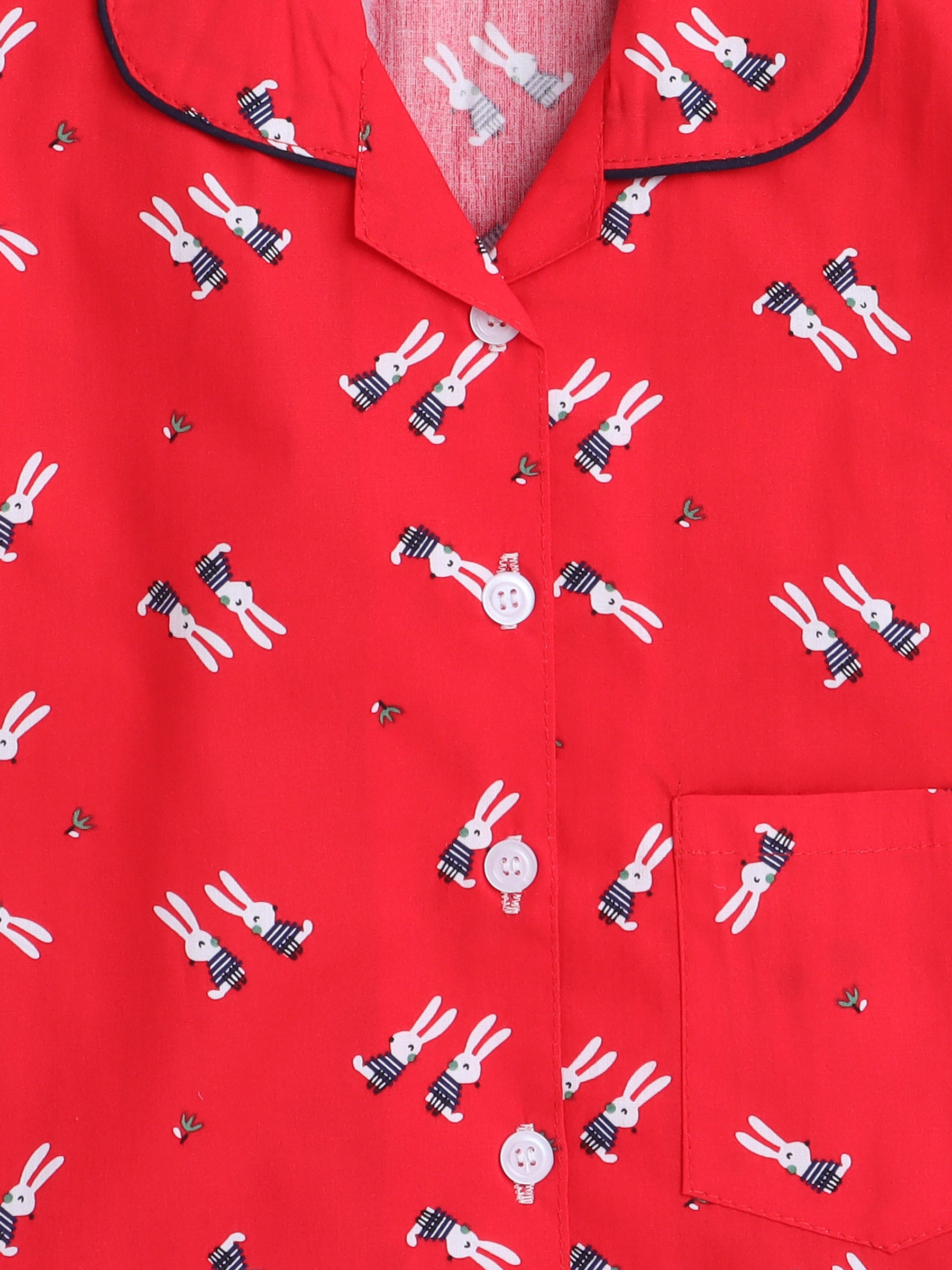 Cute Bunny Printed Full Sleeves Lounge Wear Night Suit Set For Kids Red