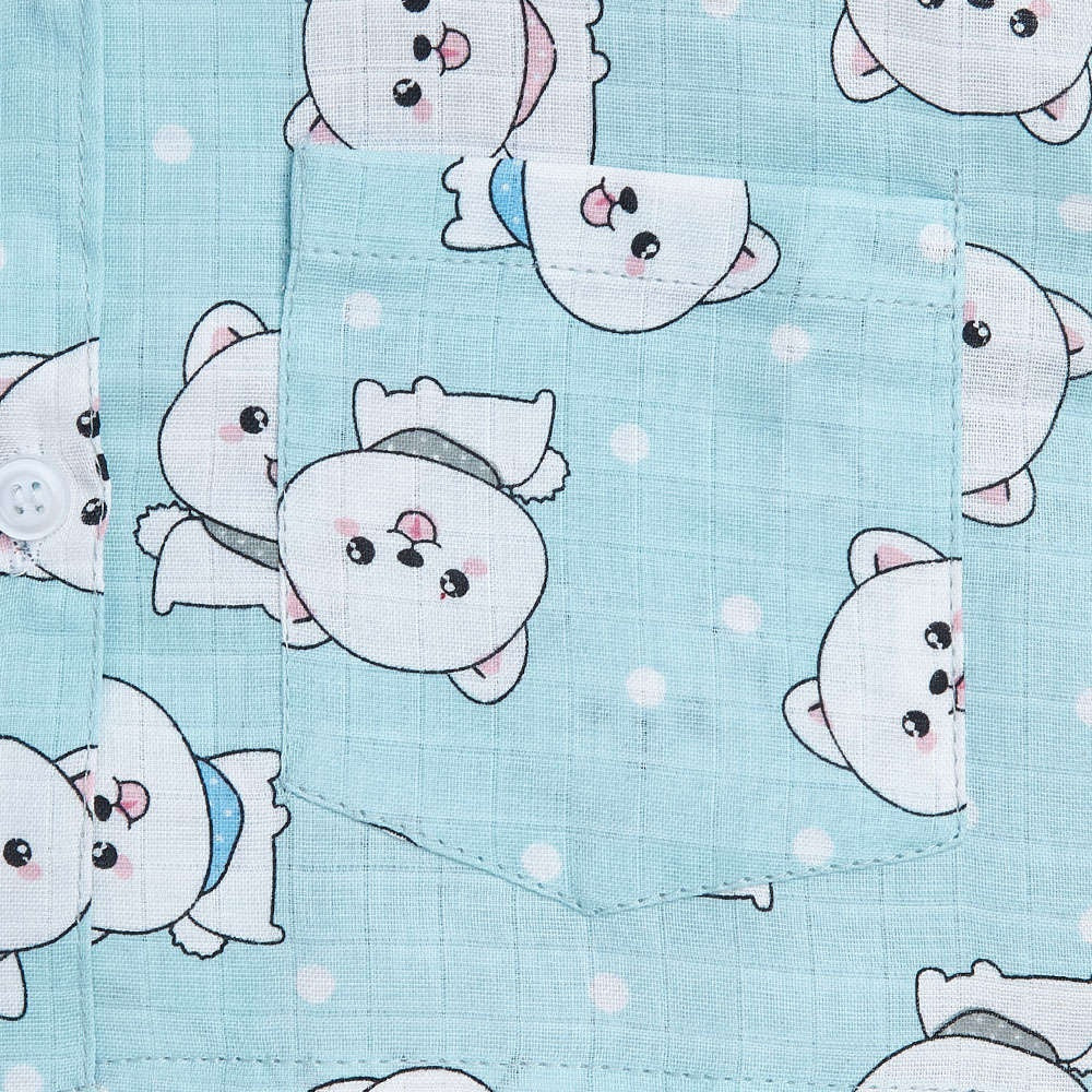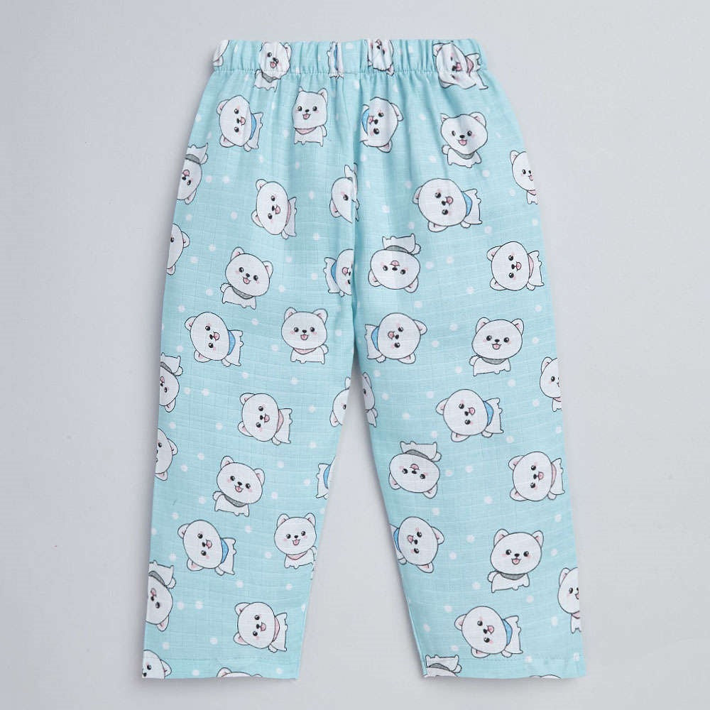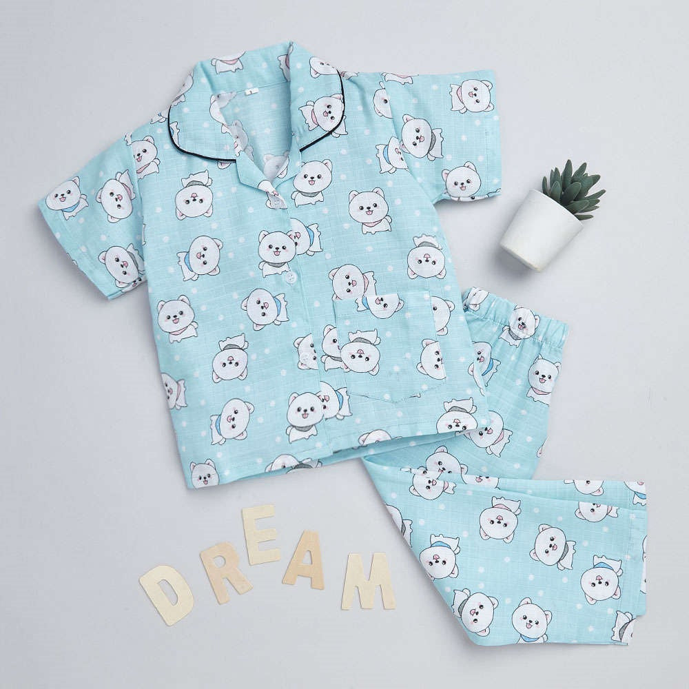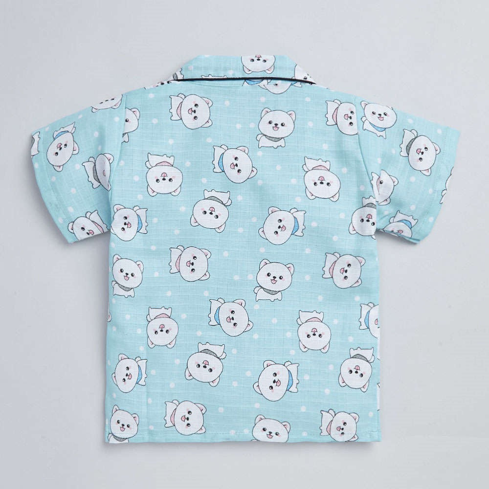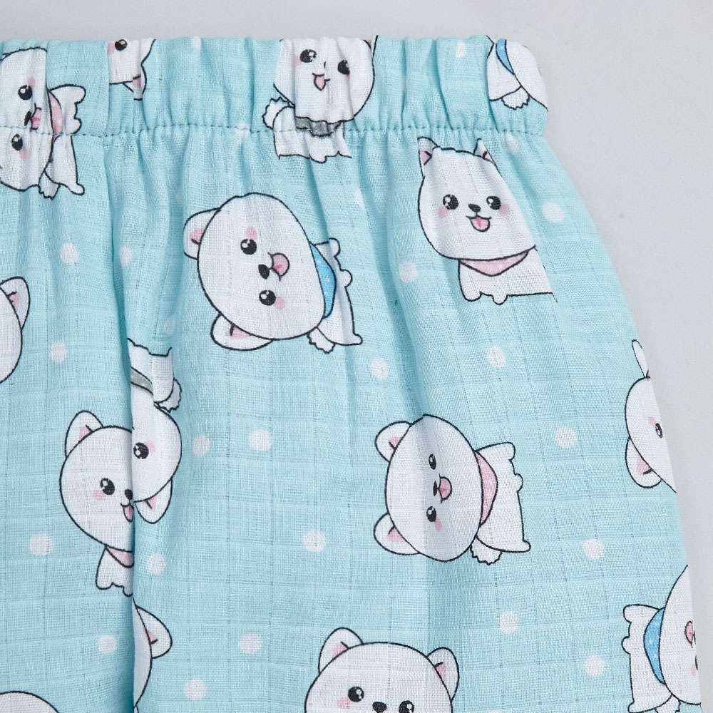 Cute Cat Printed Half Sleeves Top and Shorts Set Night Suit Set For Kids Blue