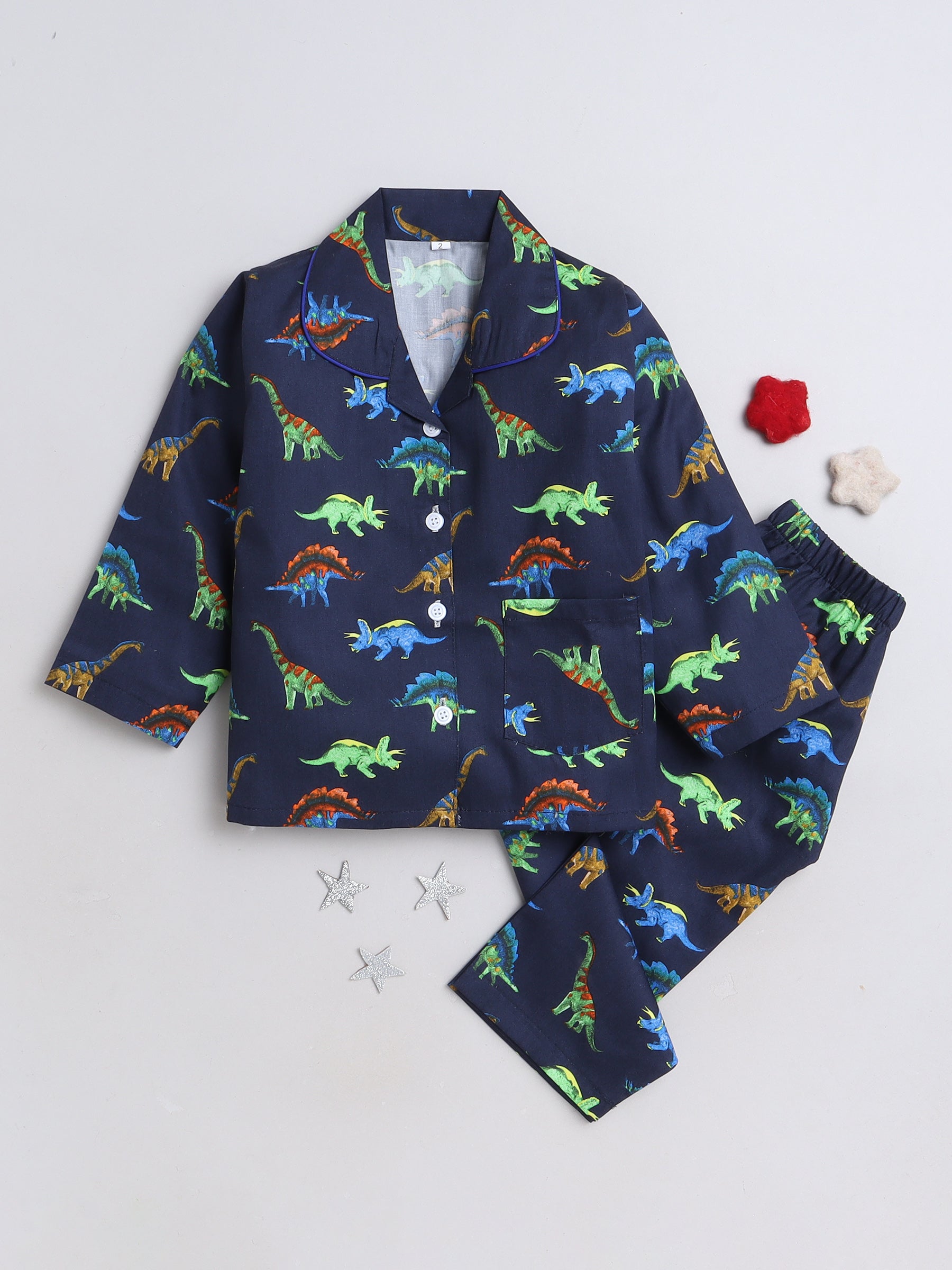 Dianosaur Printed Full Sleeves Lounge Wear Night Suit Set For Kids Naby Blue