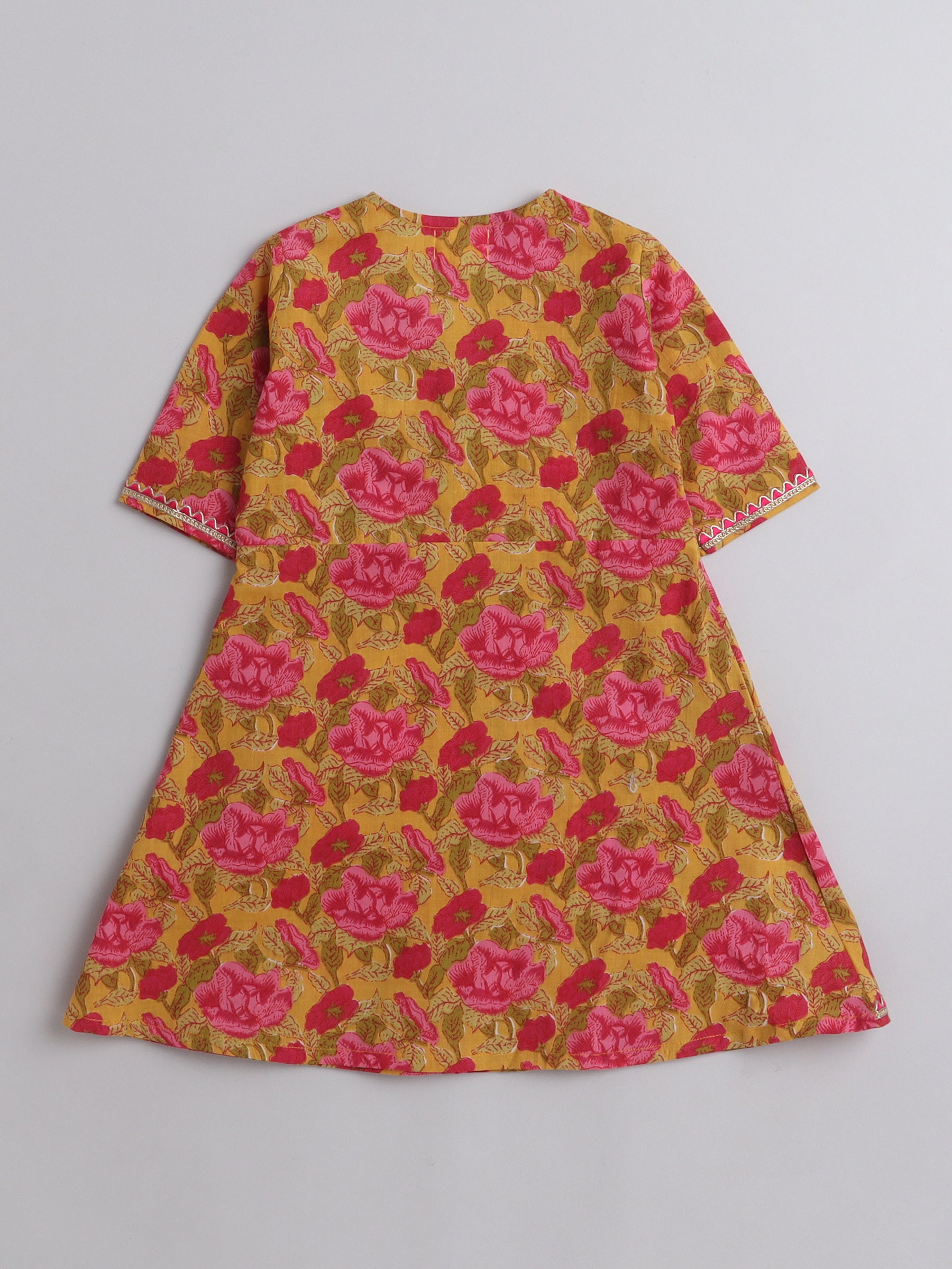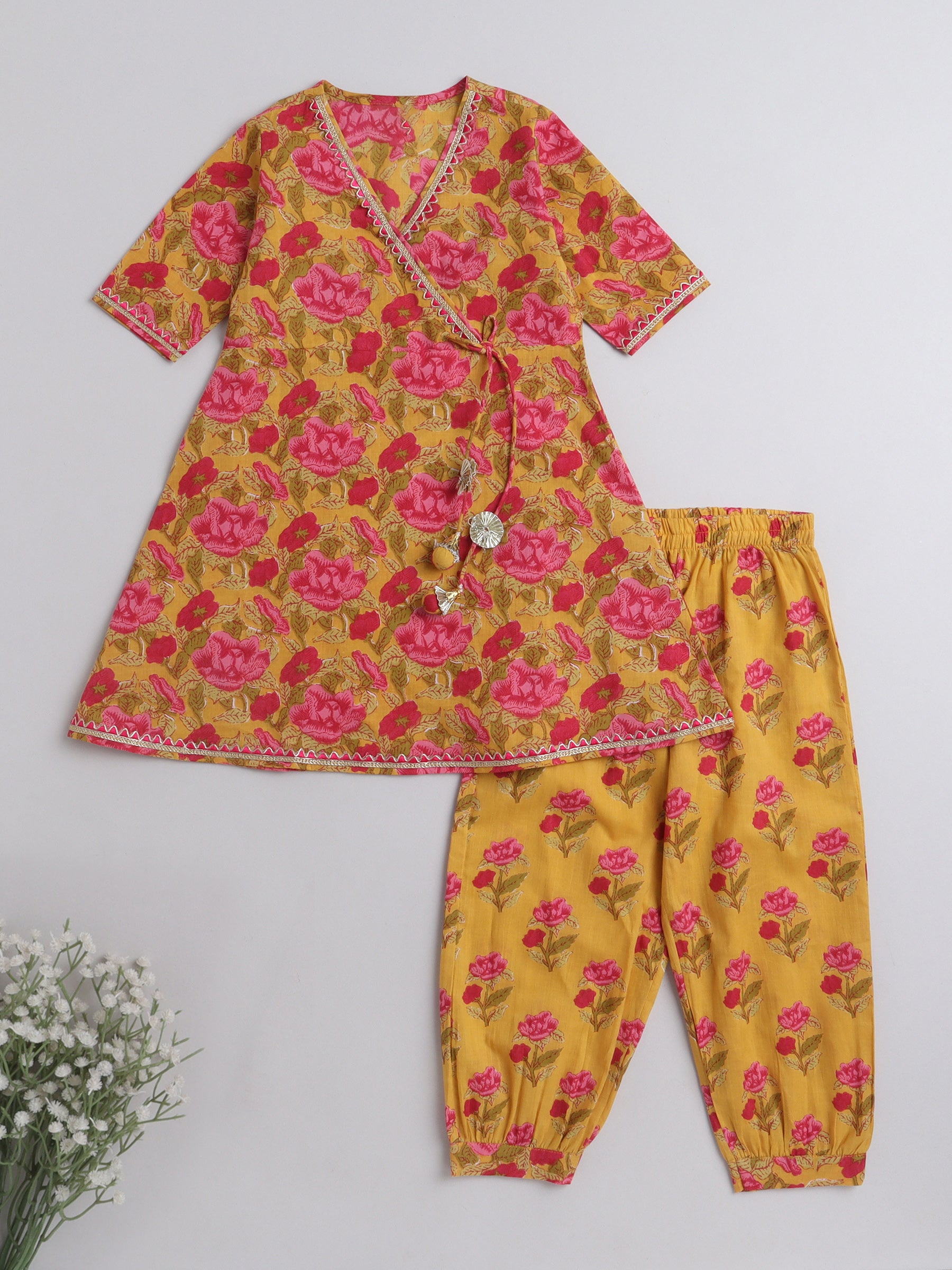 Floral Print Elbo Sleeves Gota Lace Kurta & Balloon Pant Set For Girls-Yellow