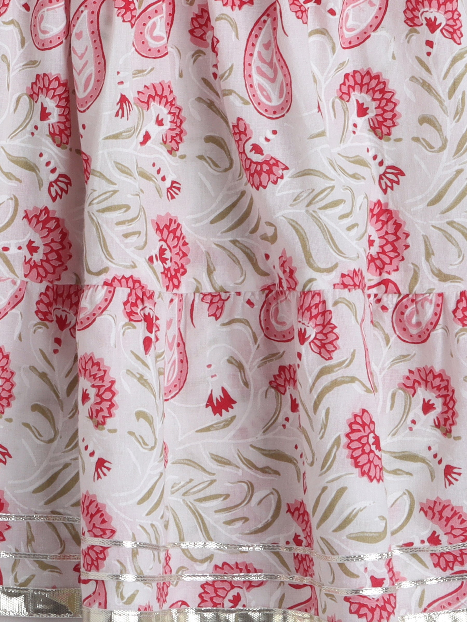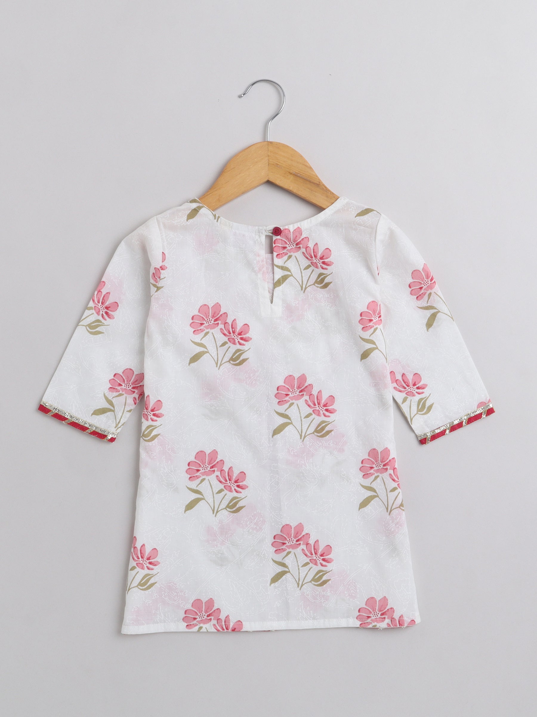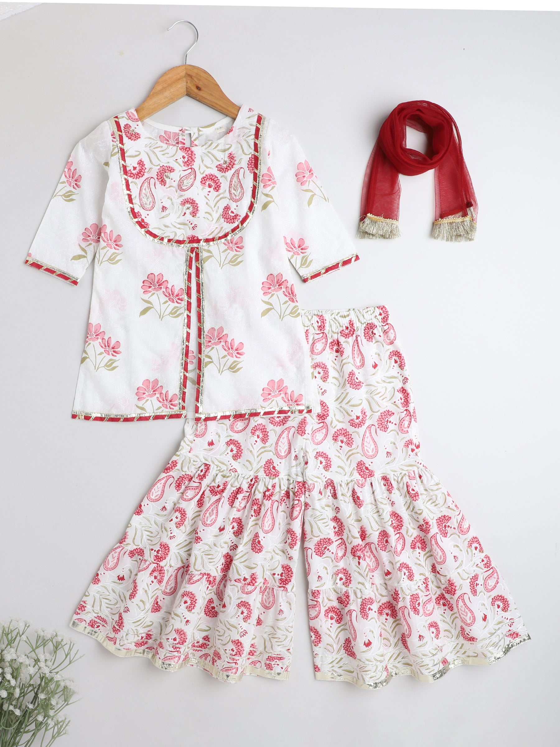 Floral Print Short Sleeves Gota Lace Detailing Kurta & Sharara Set With Dupatta For Girls-Pink