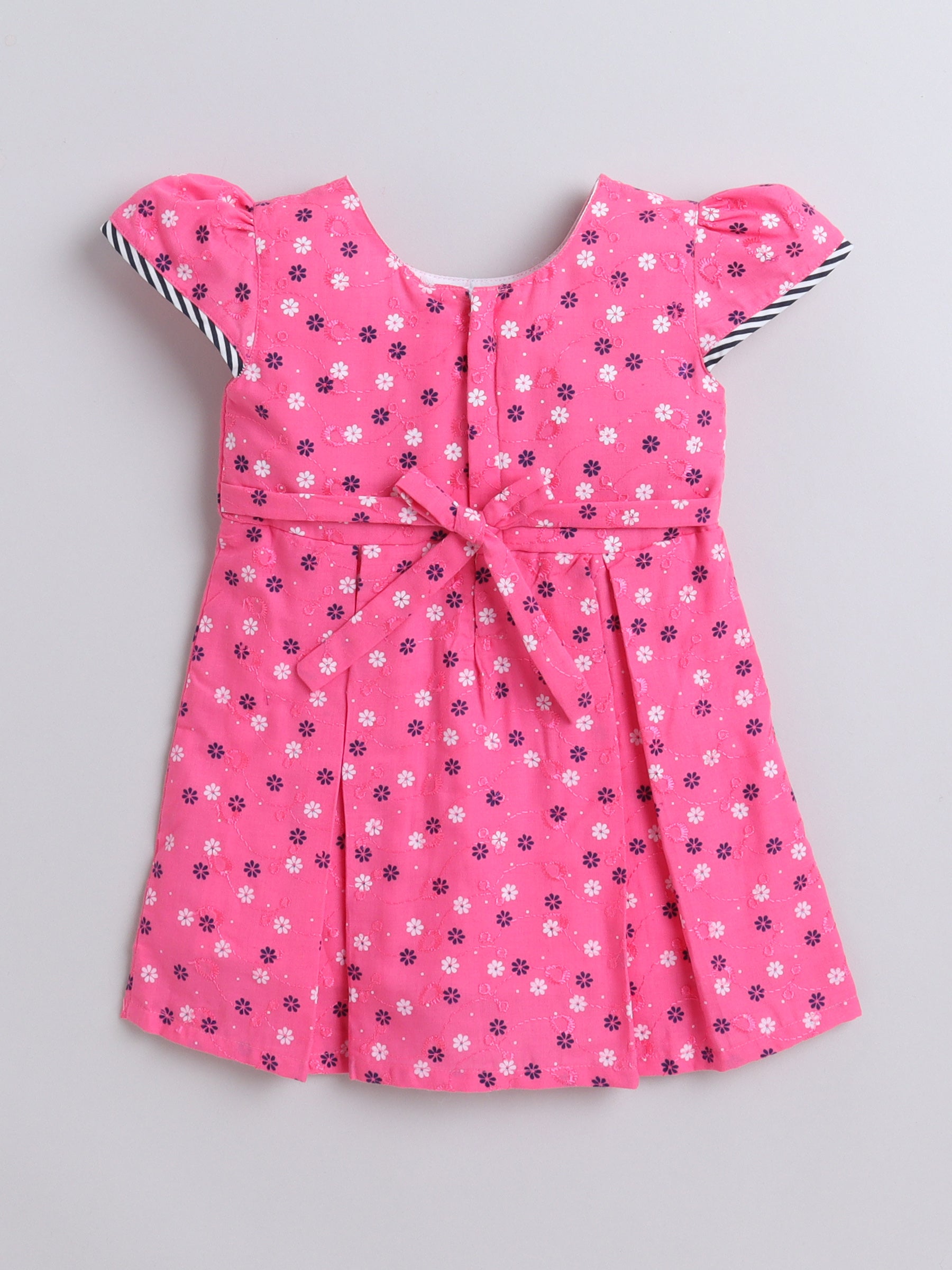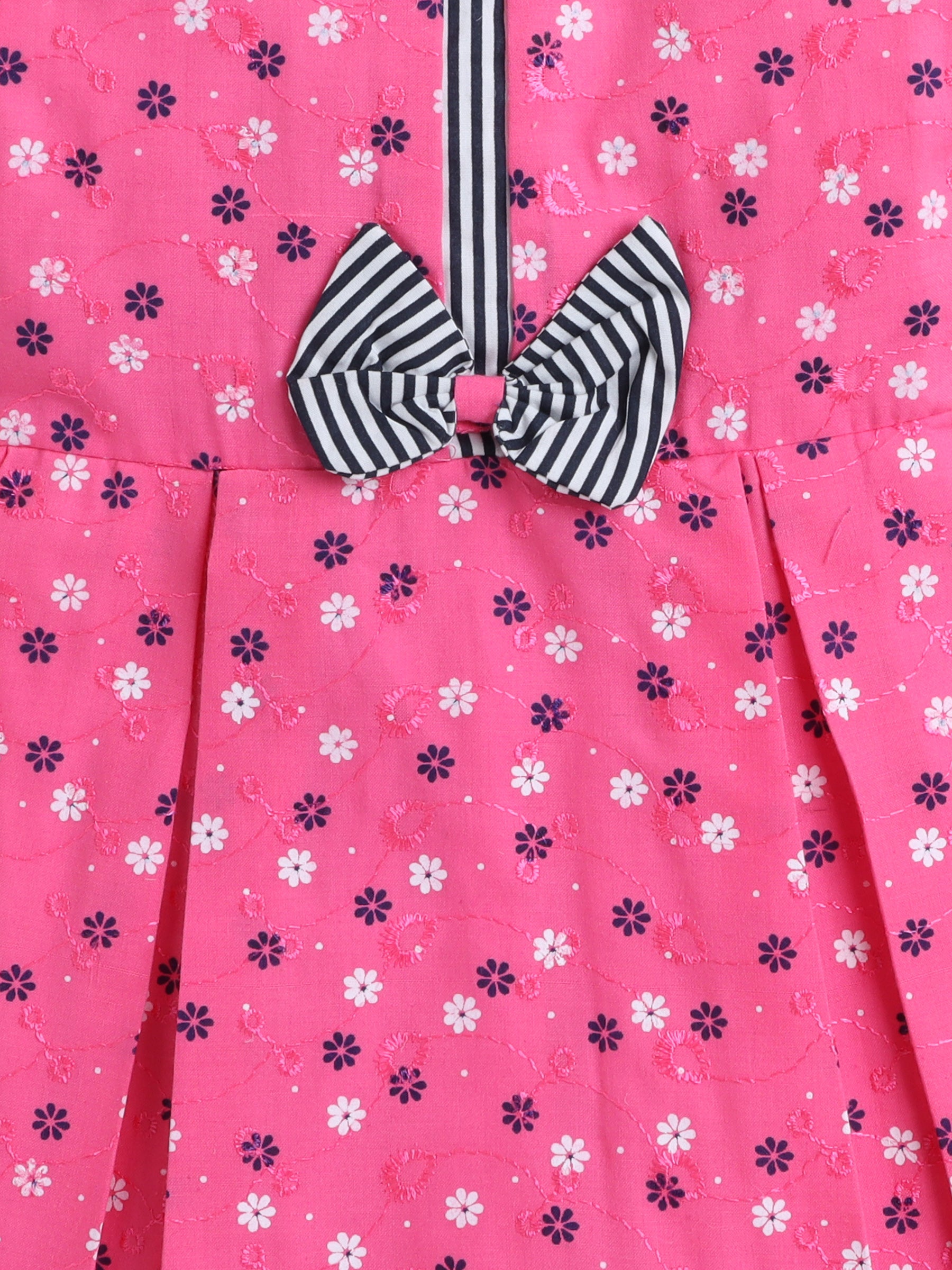 Floral Printed Cap Sleeve Bow Embelished Dress For Girls - Pink