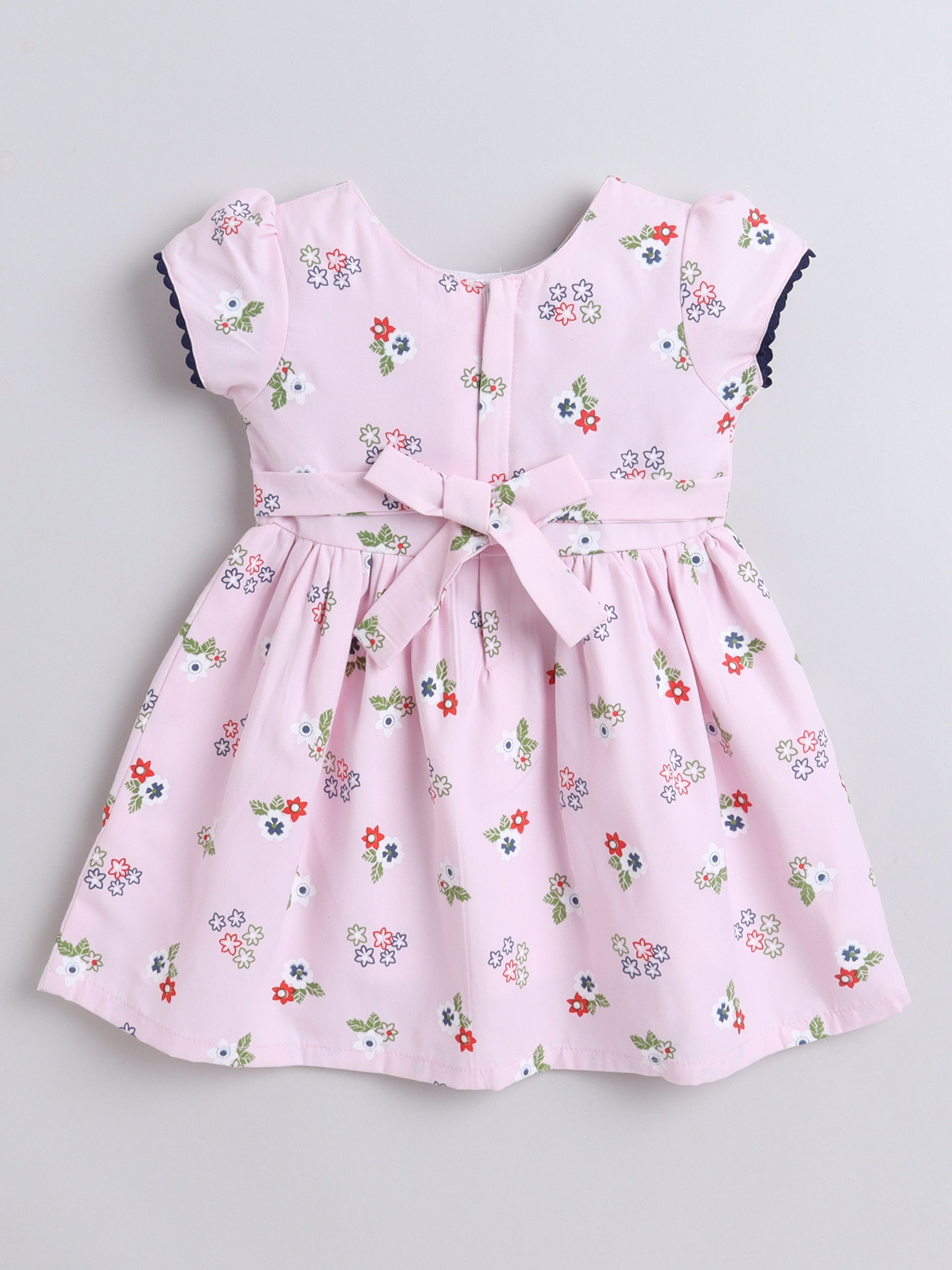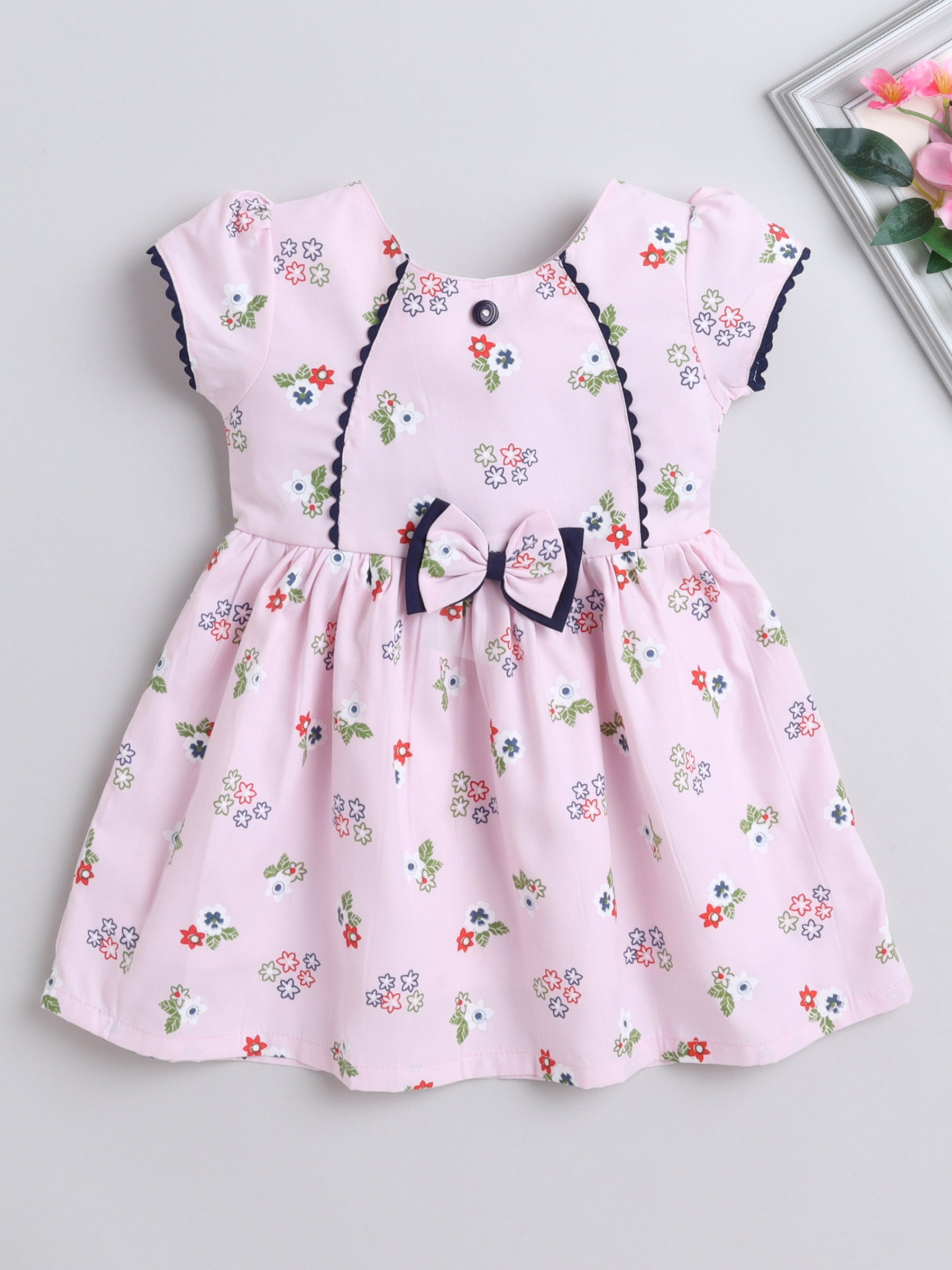 Floral Printed Cap Sleeves Bow Embelished Dress For Girls - Pink
