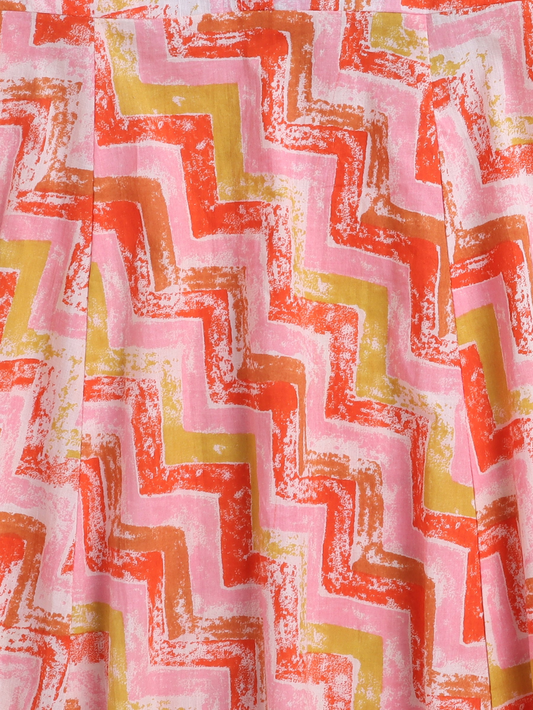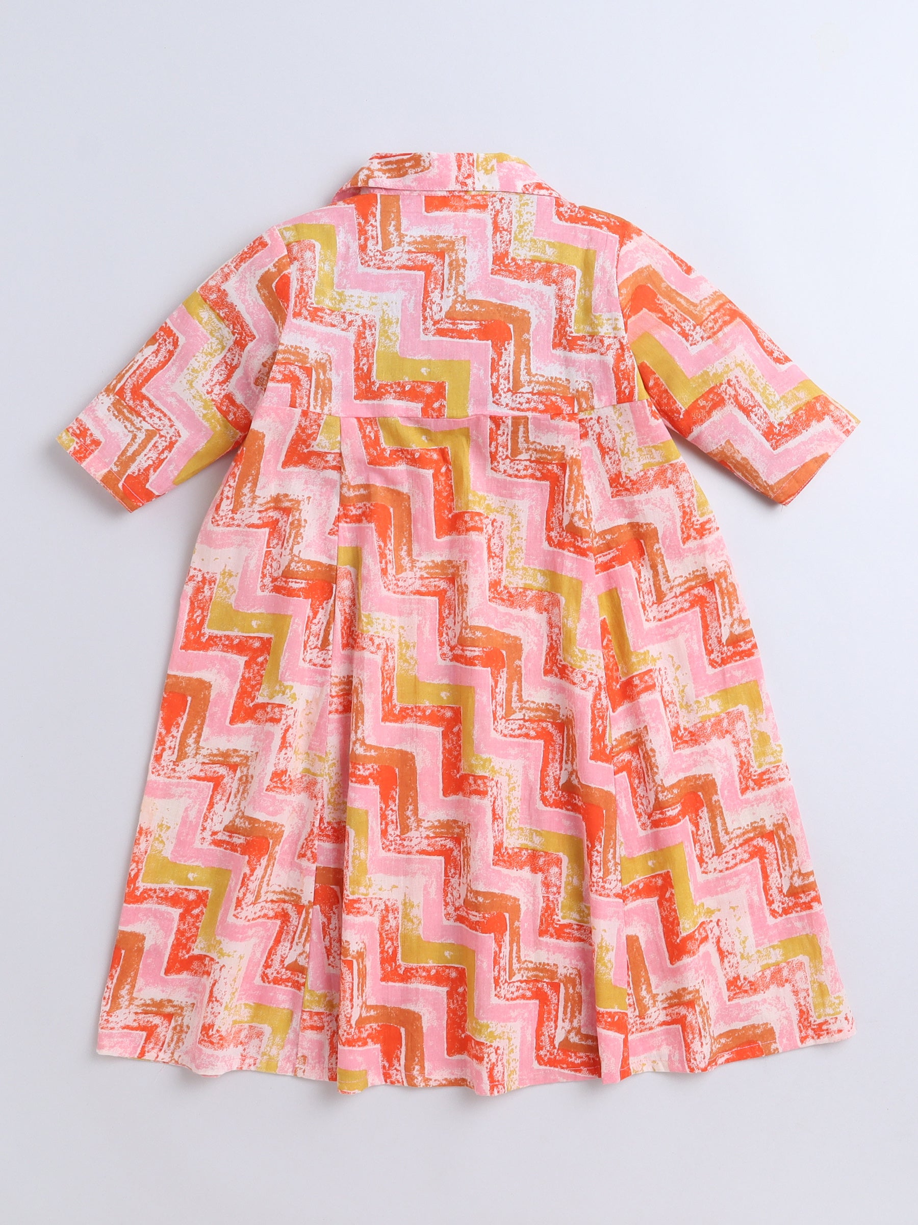 Floral Printed Elbow Sleeves Collar Neck Dress For Girls-Pink