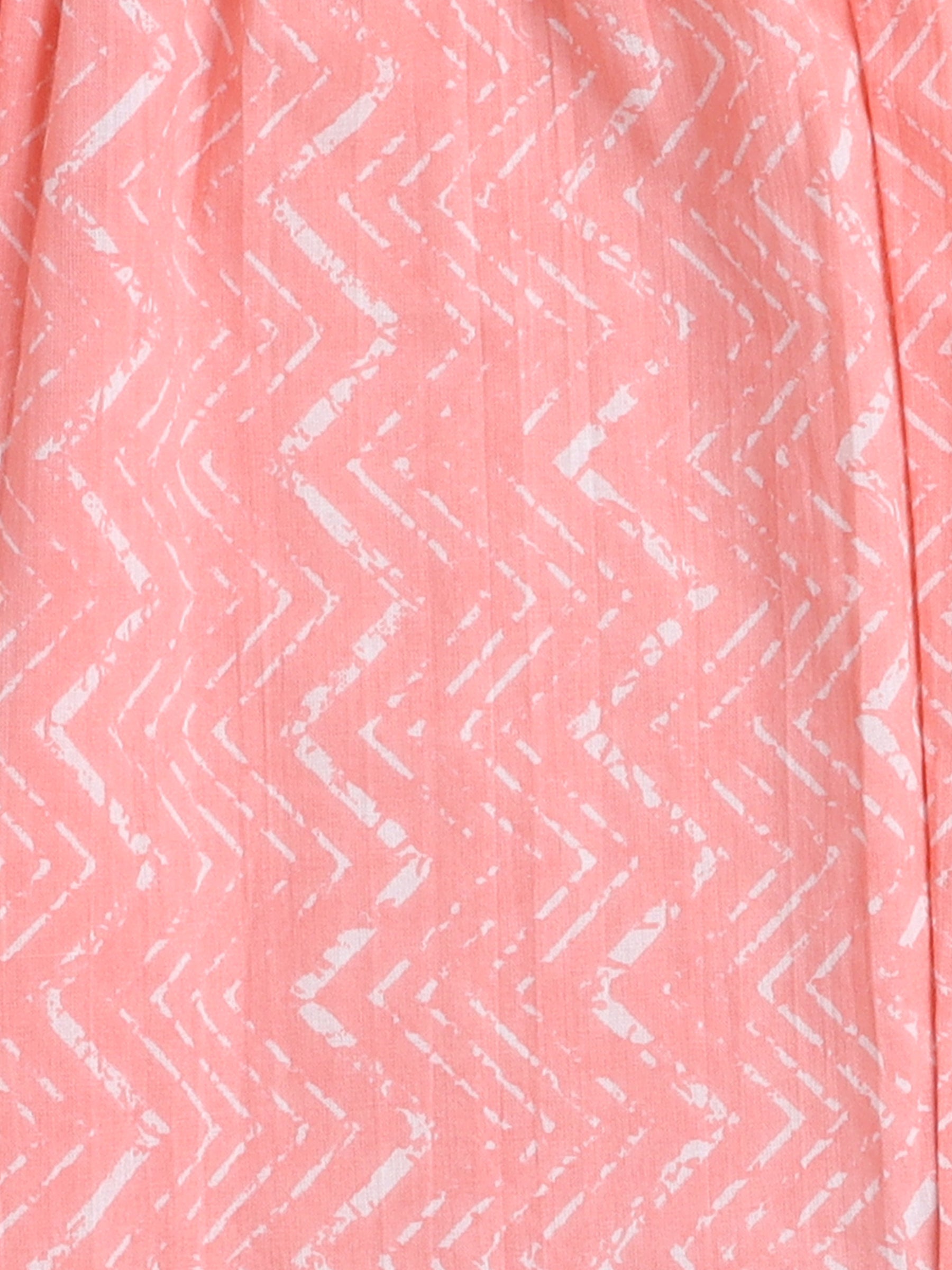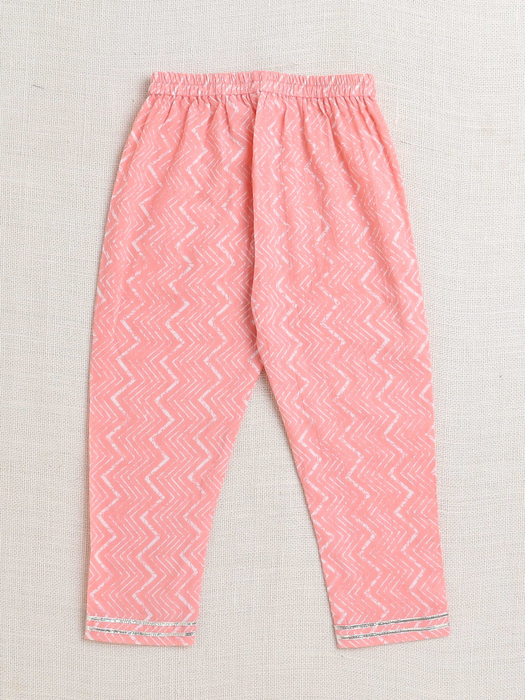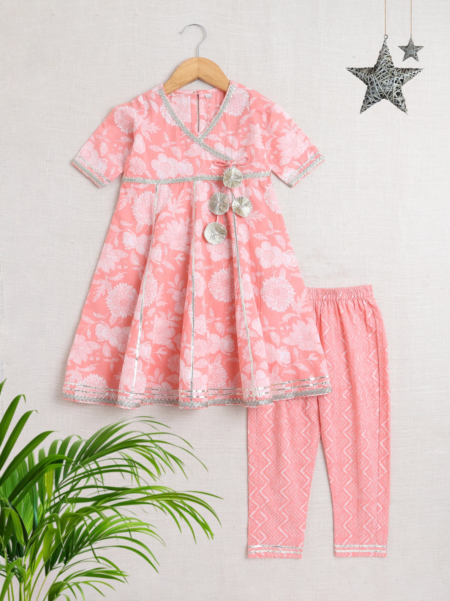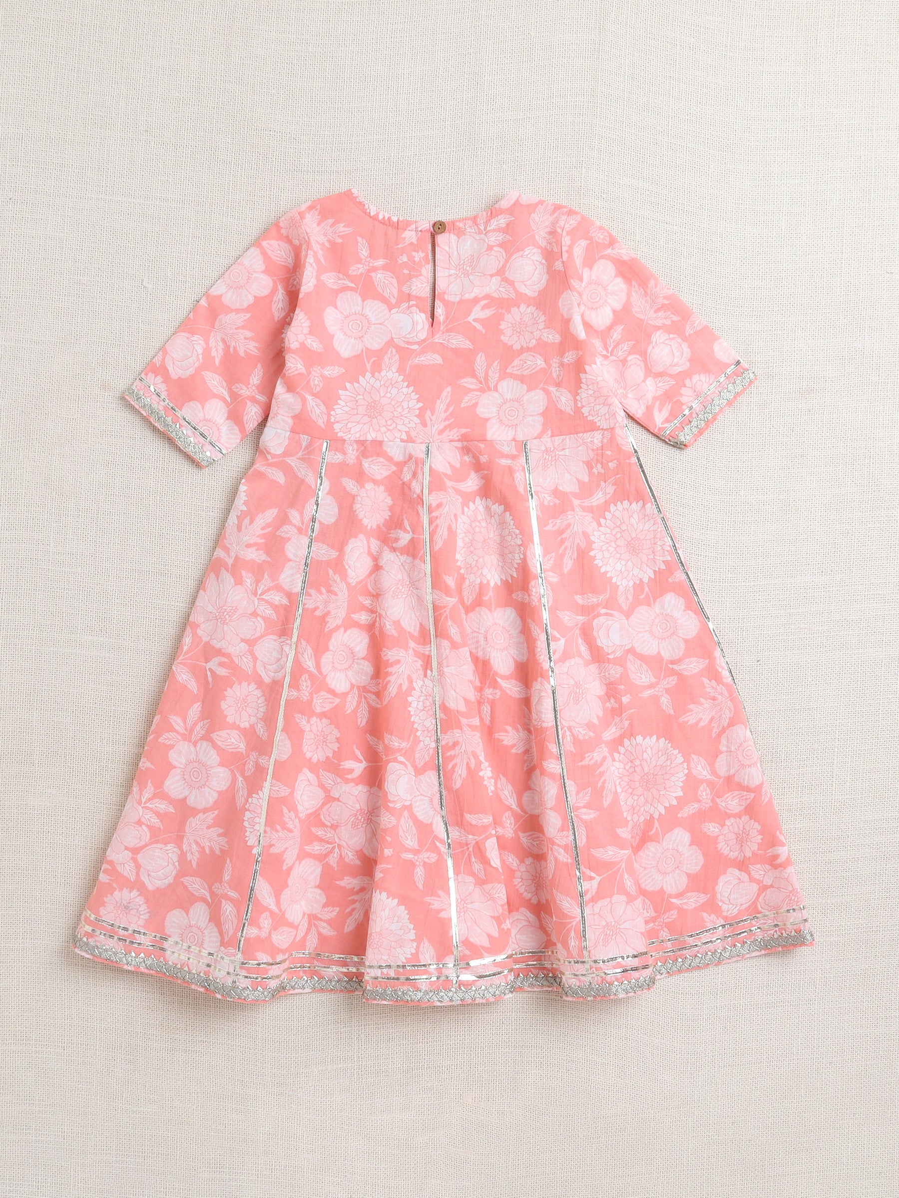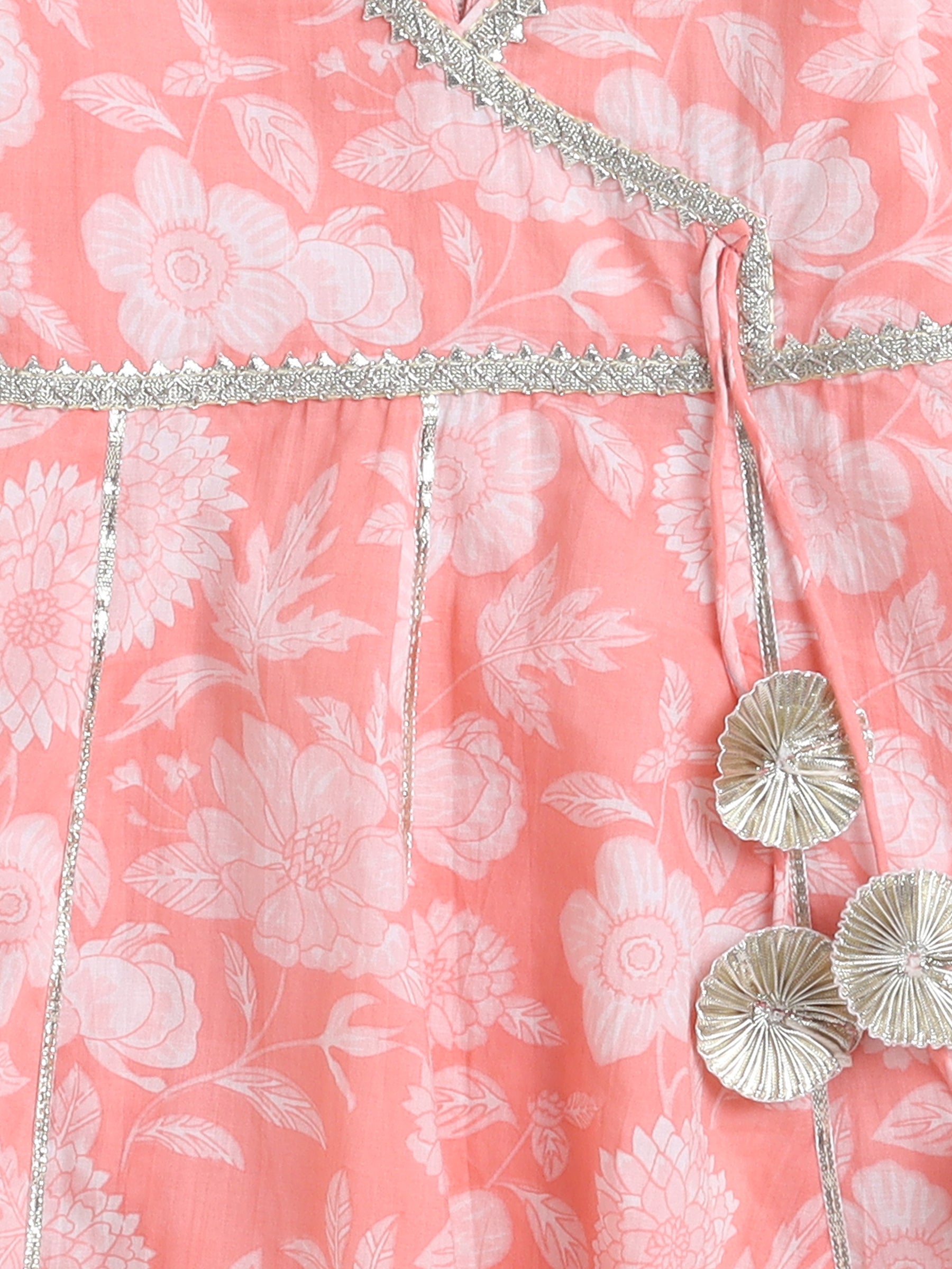 Floral Printed Elbow Sleeves Gota Lace Tassled Anarkali Kurti And Pant Set-Peach