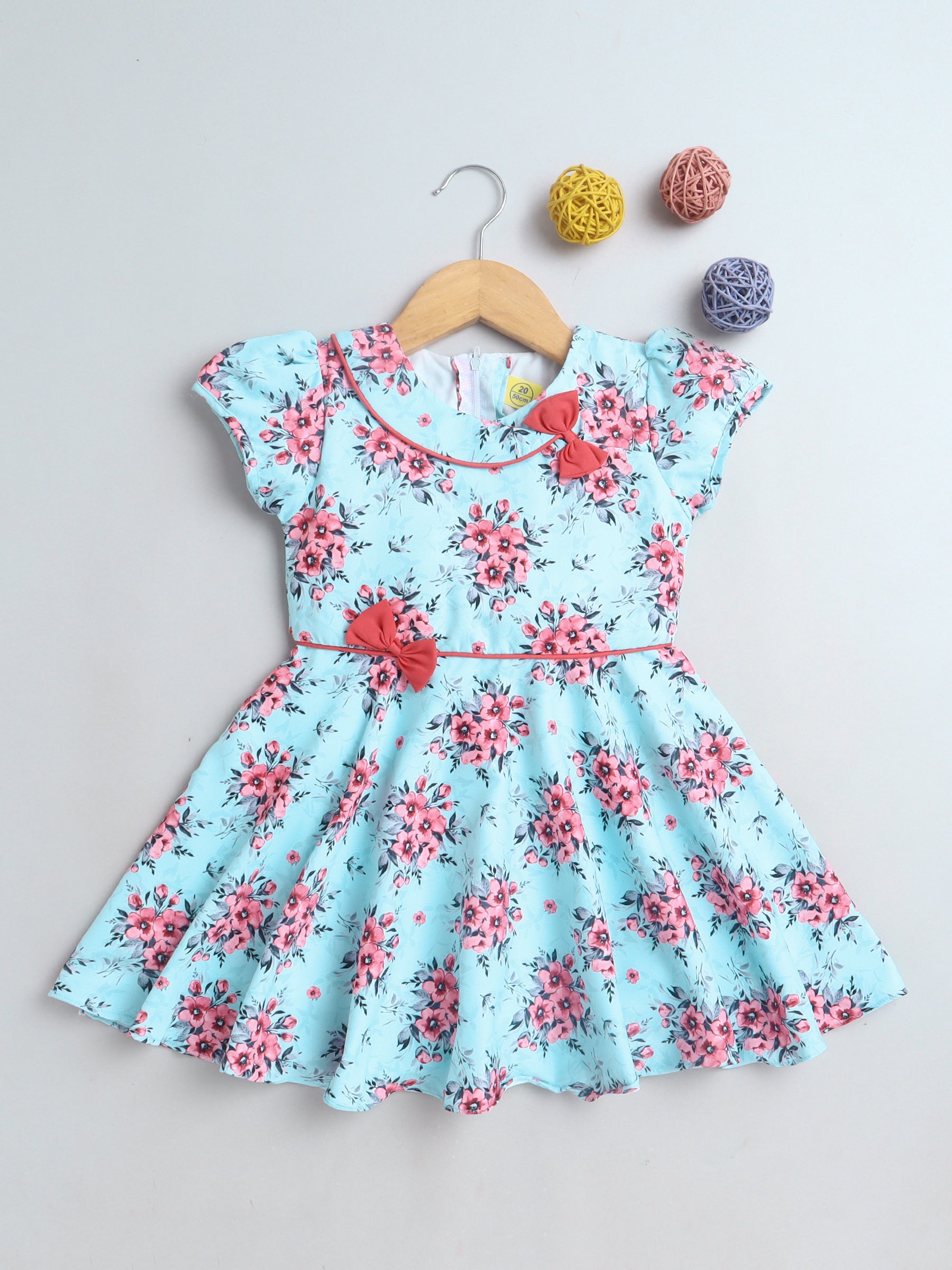 Floral Printed Short Sleeves Dress With Bow For Girls-Green