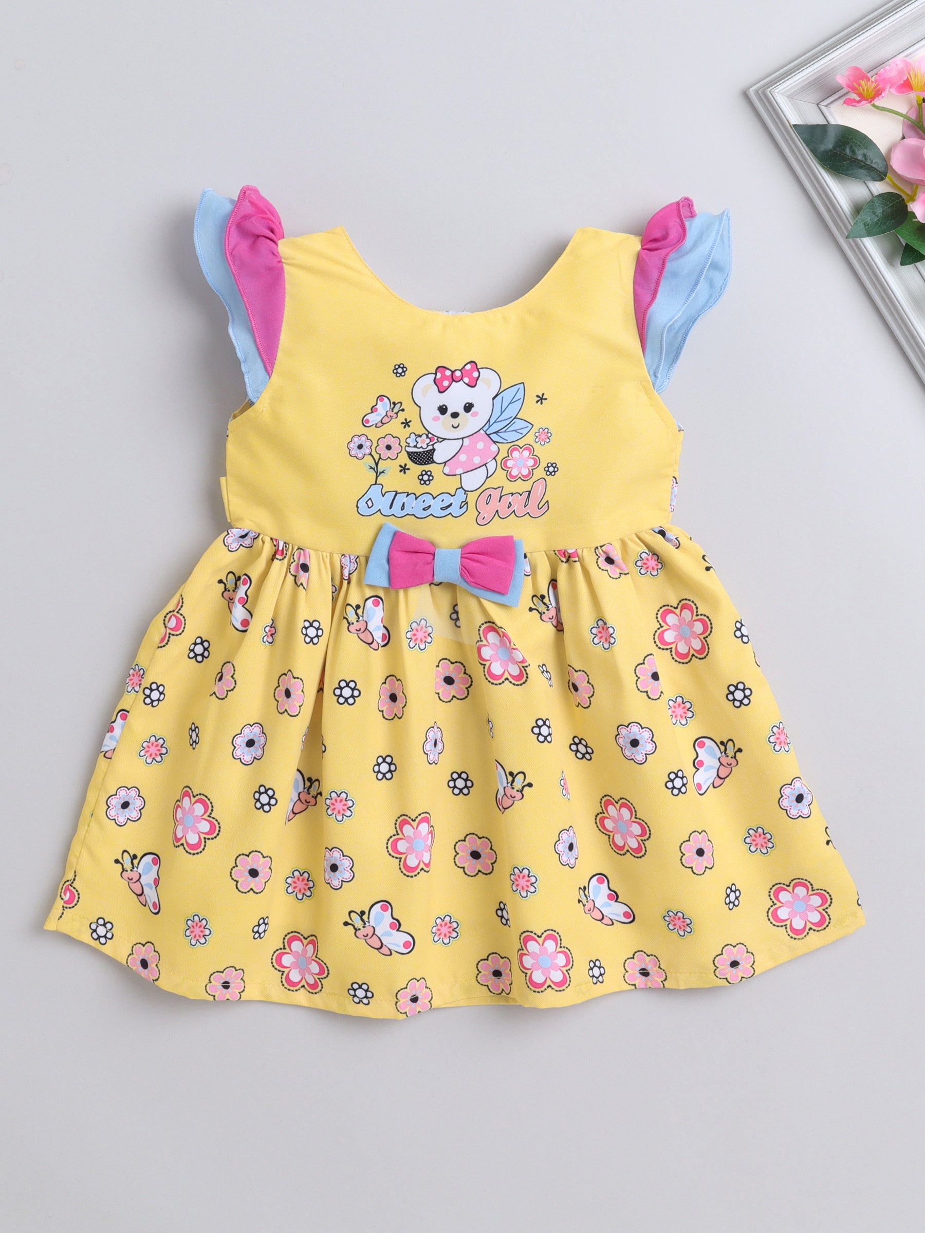 Floral Printed Teddy Print Cap Sleeves Dress For Girls- Yellow