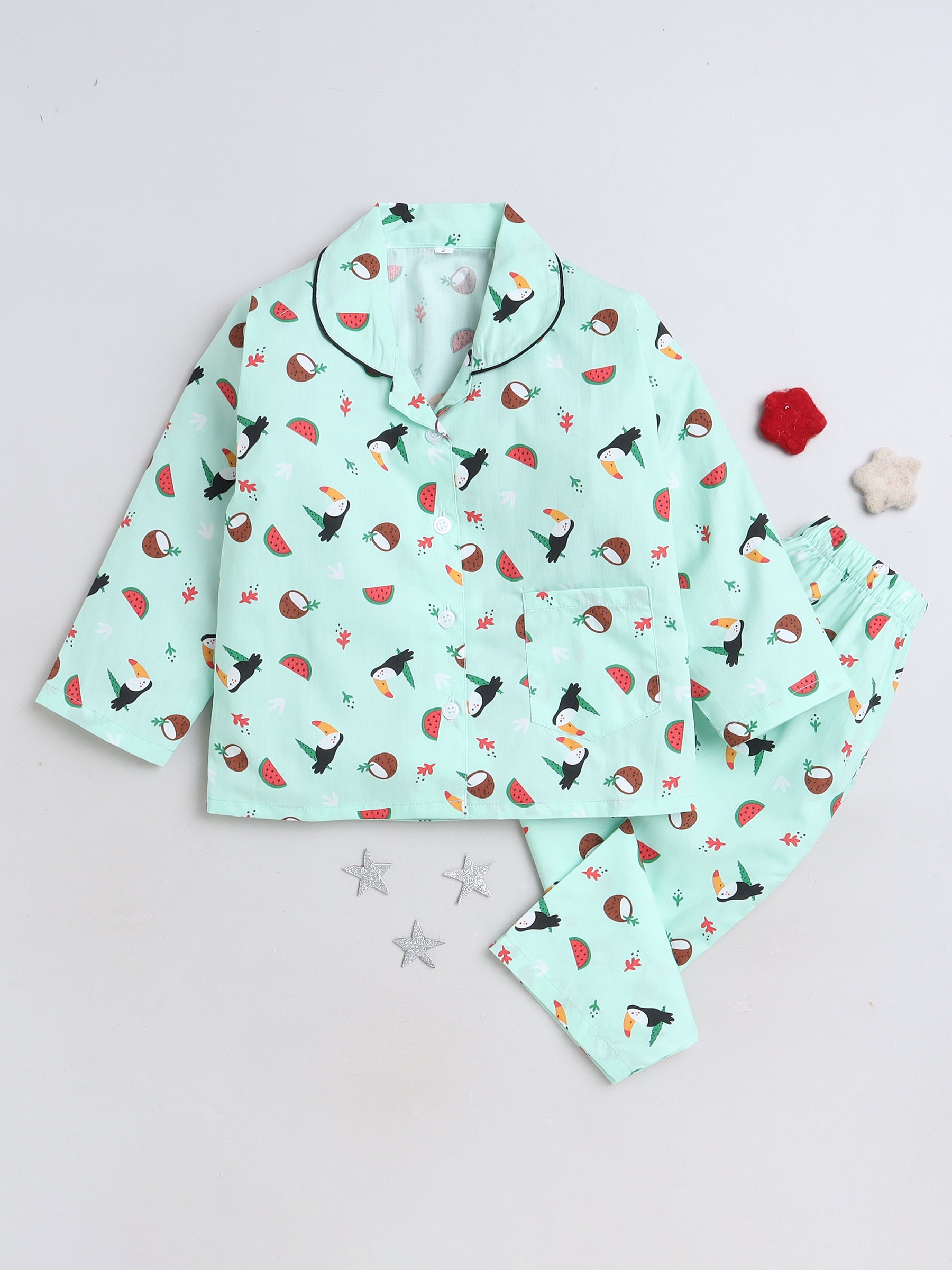 Fruits Printed Full Sleeves Lounge Wear Night Suit Set For Kids Mint