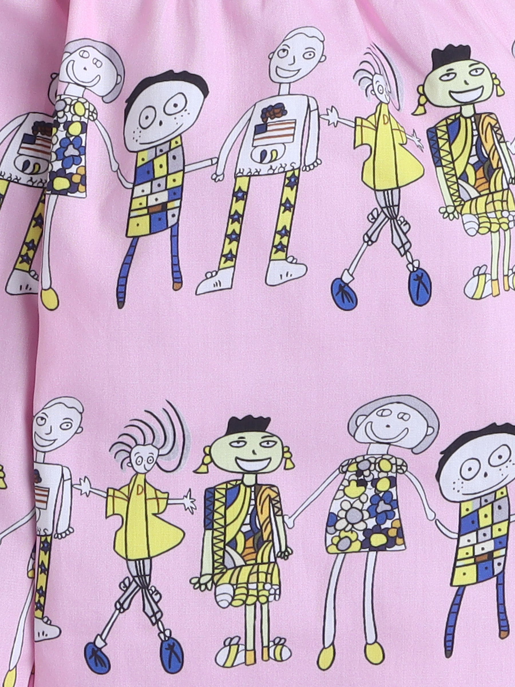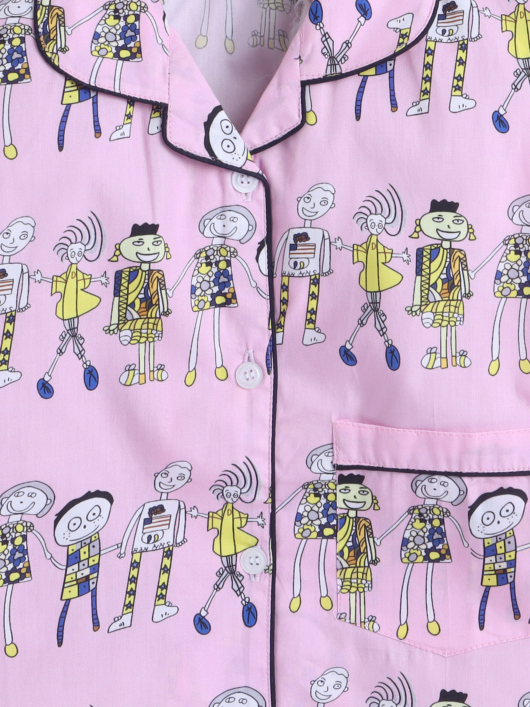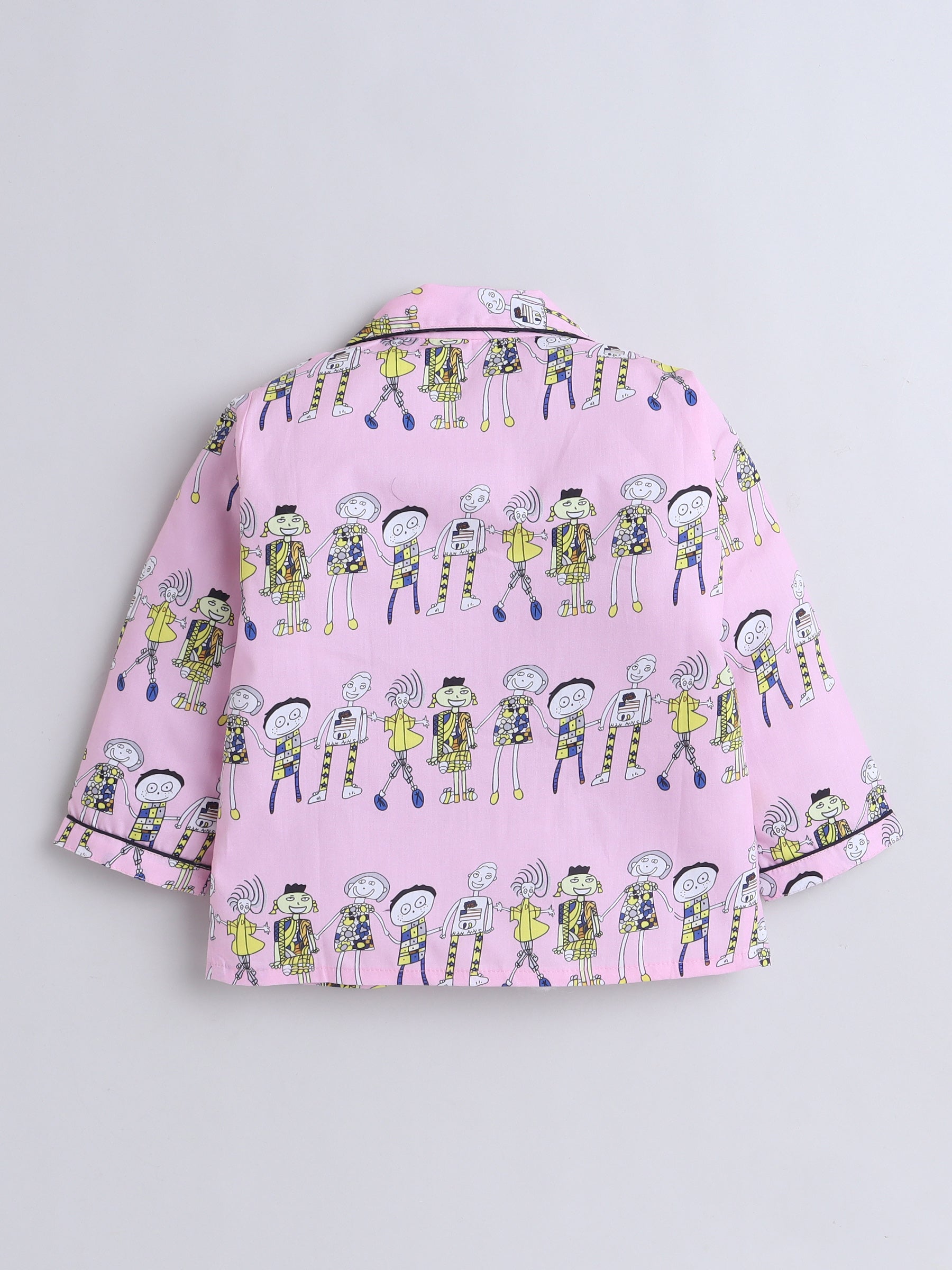 Full Sleeves Cotton All Over Printed Night Suit Set Pink