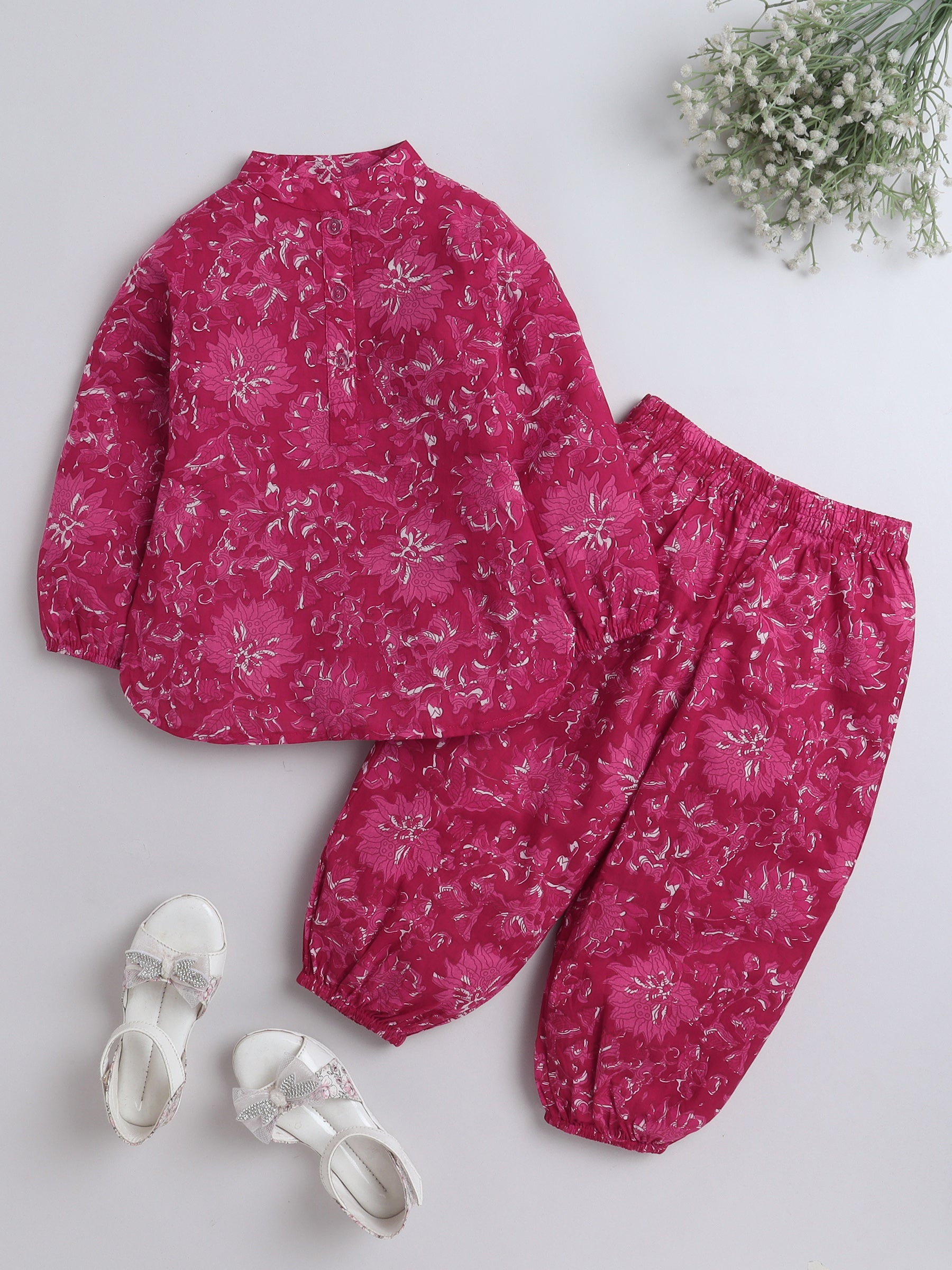 Full Sleeves Cotton Floral Print Loungewear Set Fushcia