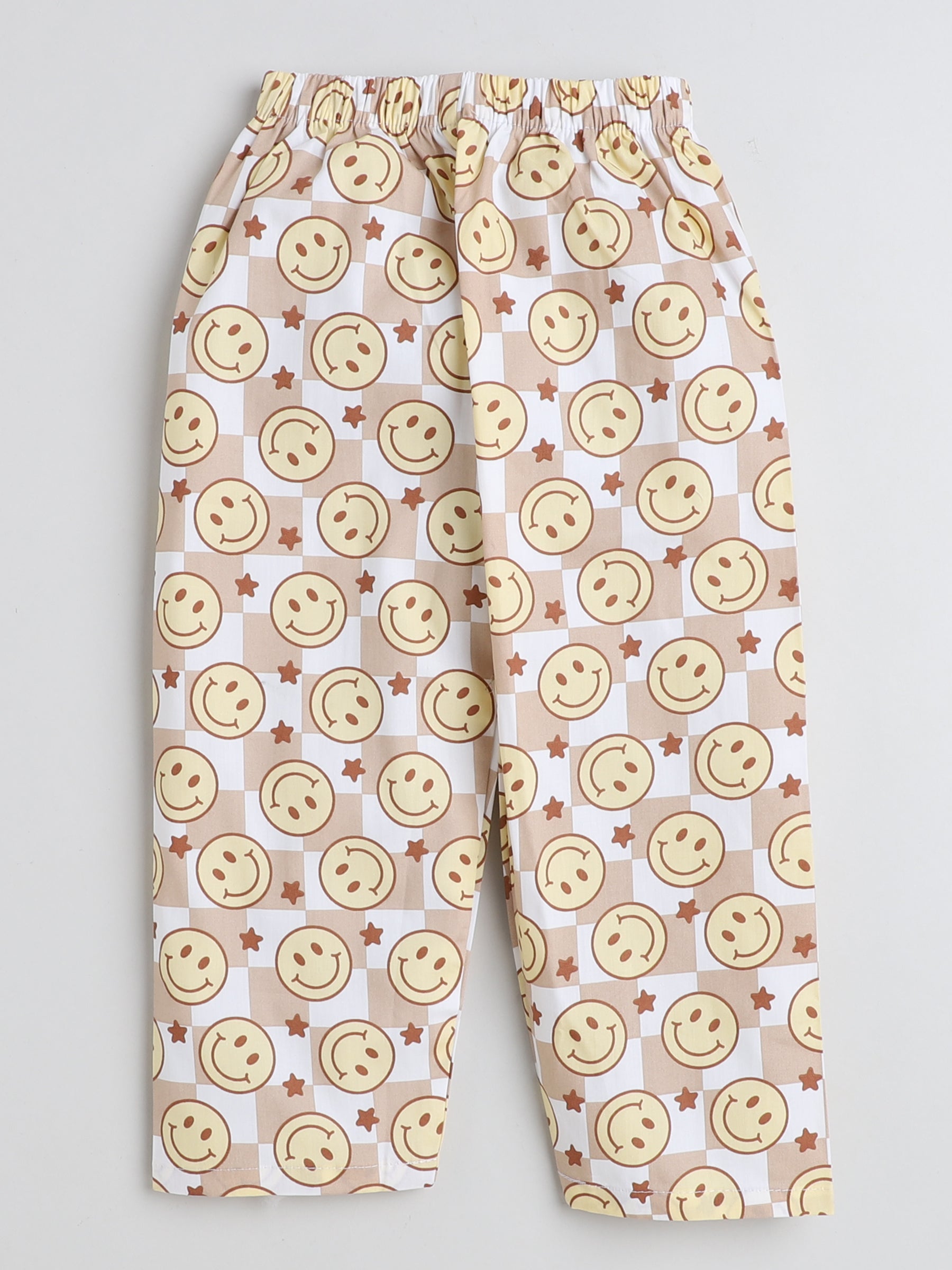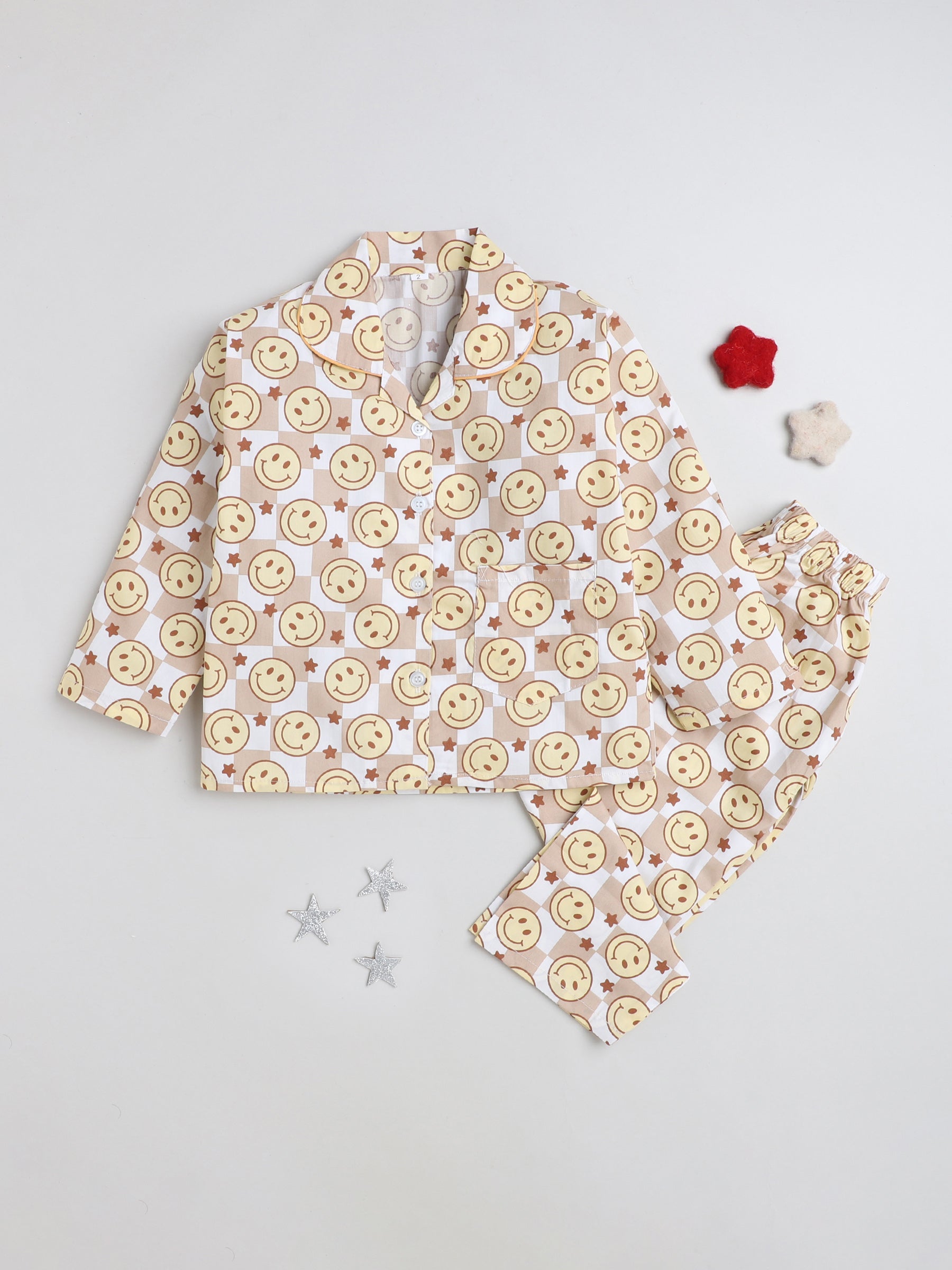 Full Sleeves Smiley Printed Lounge Wear Night Suit Set For Kids Brown