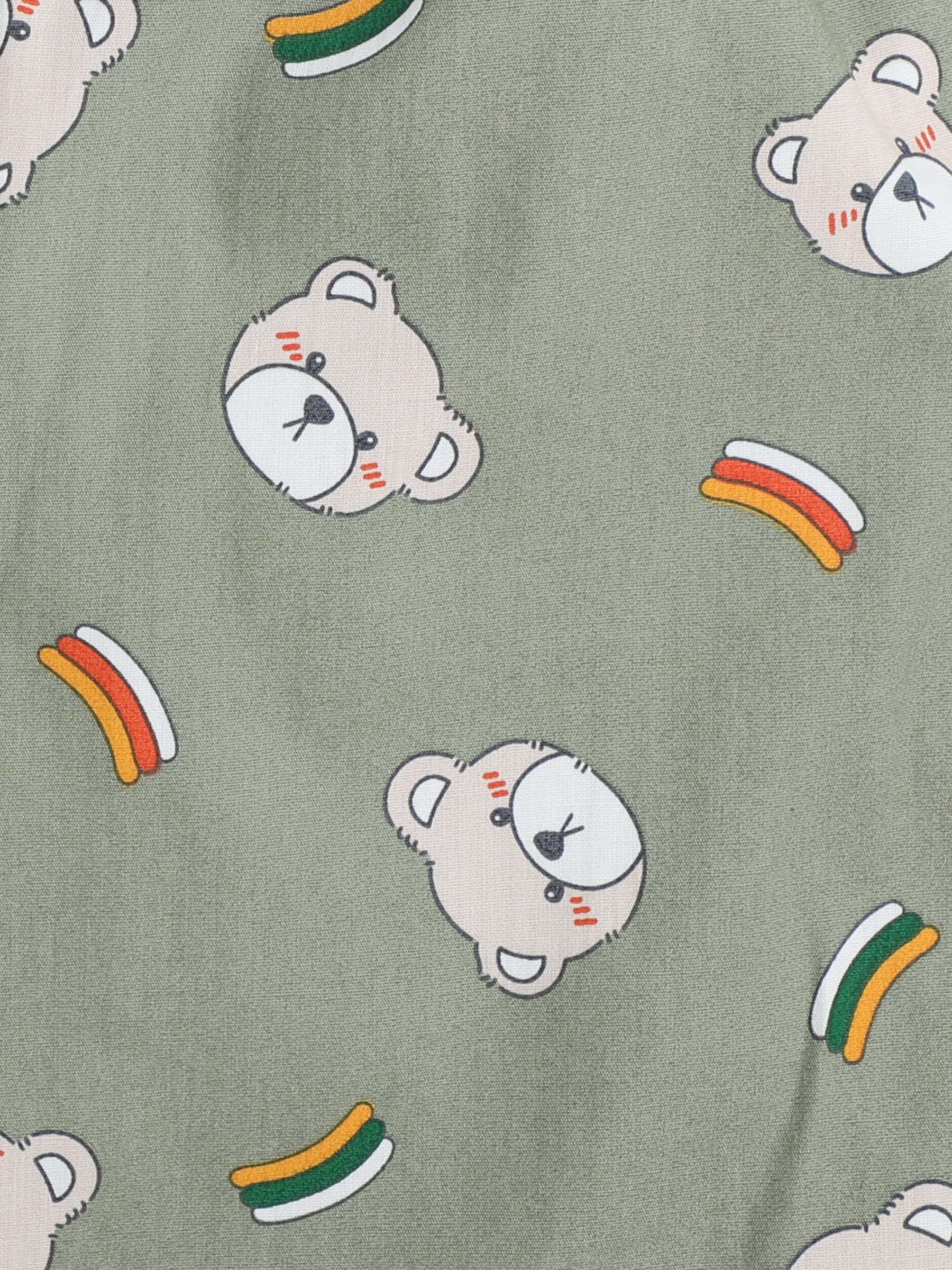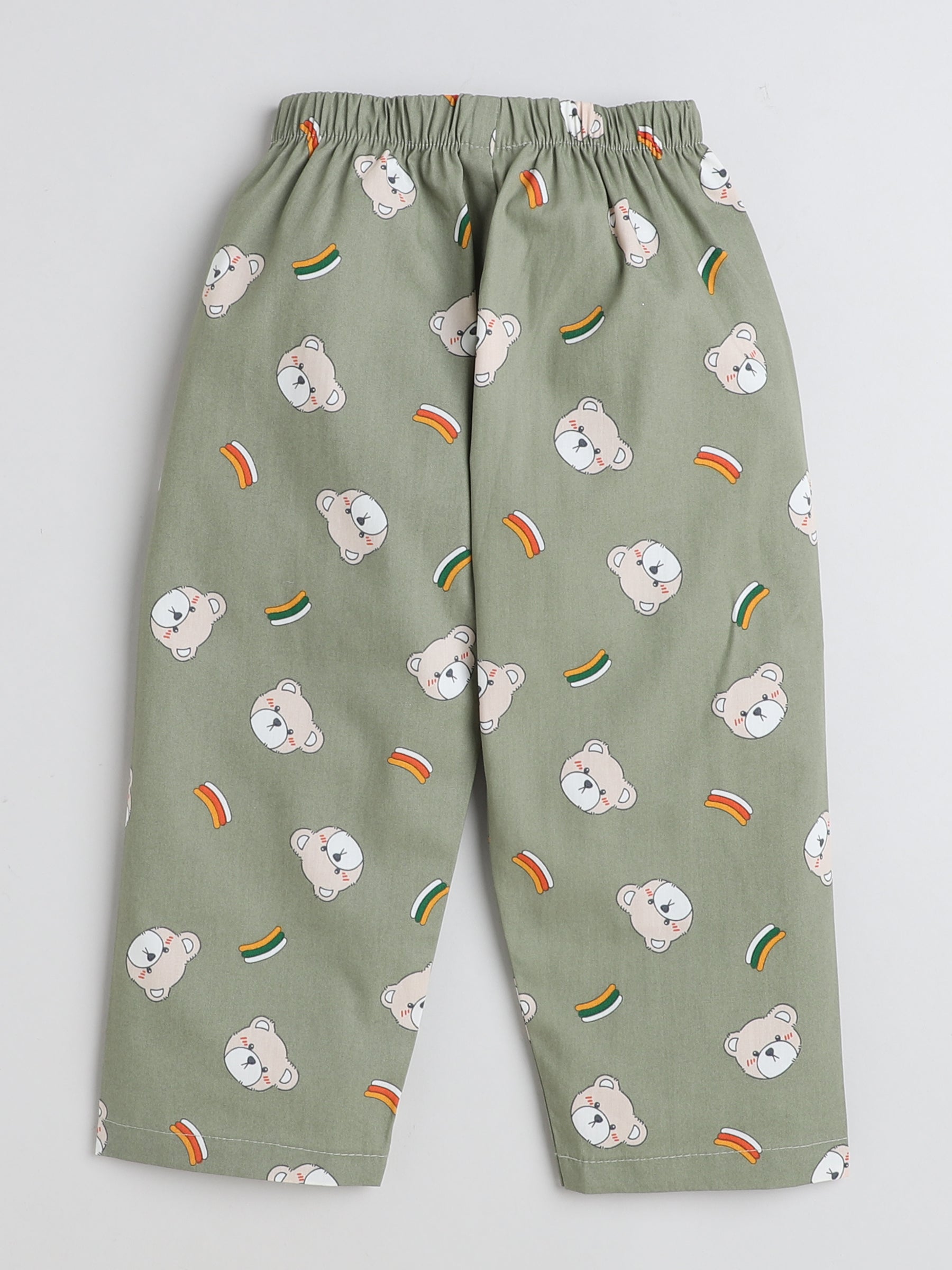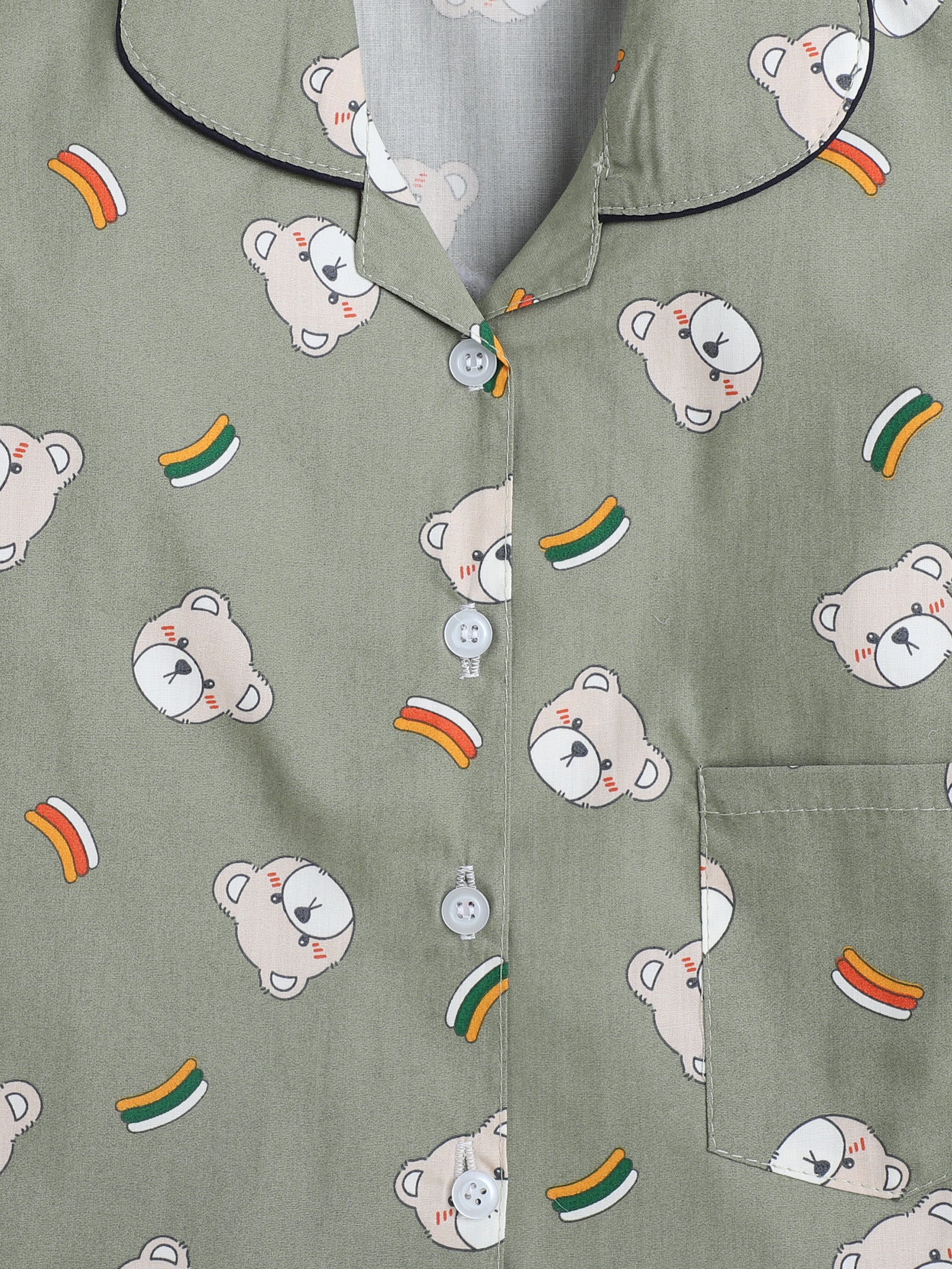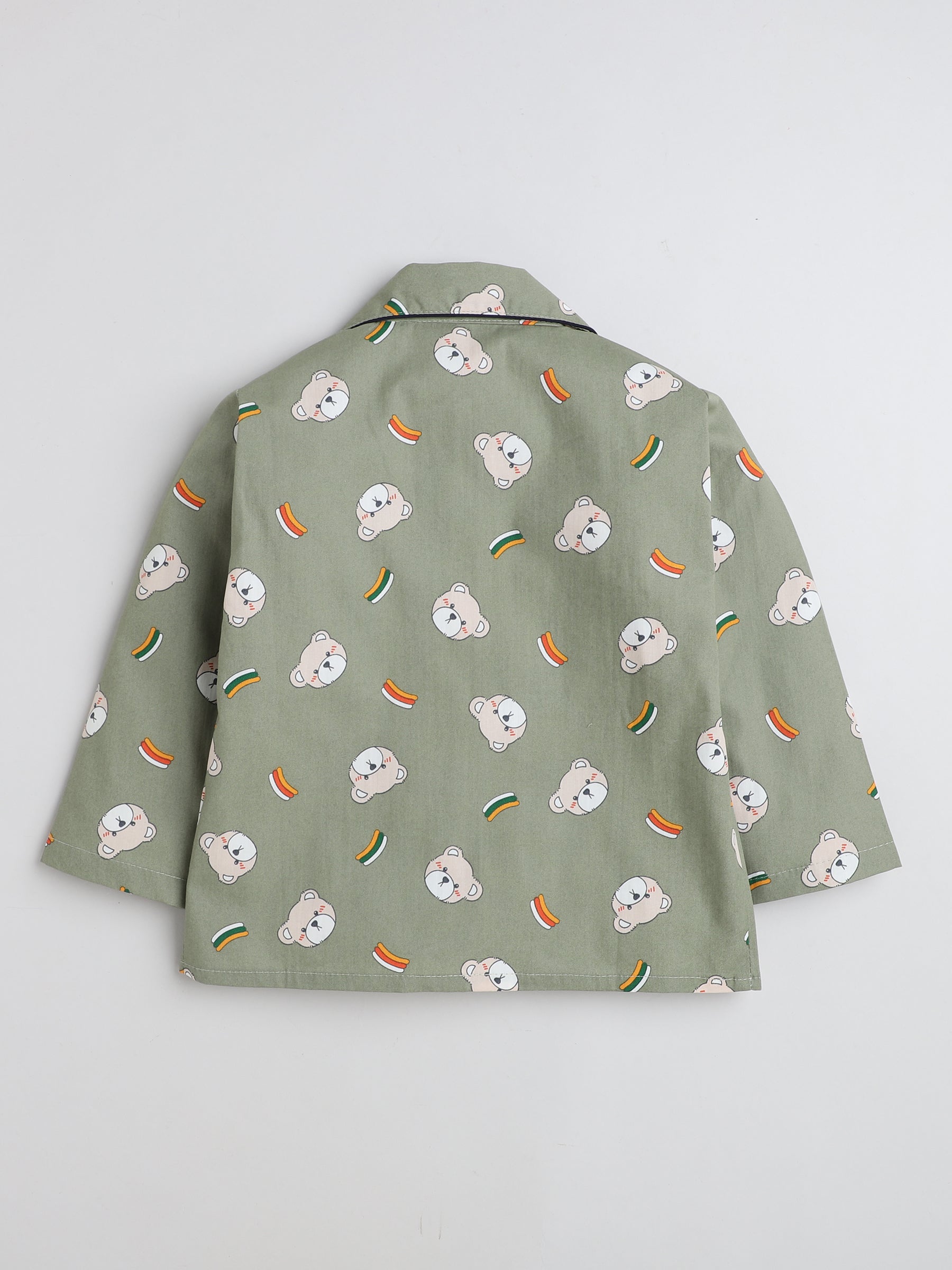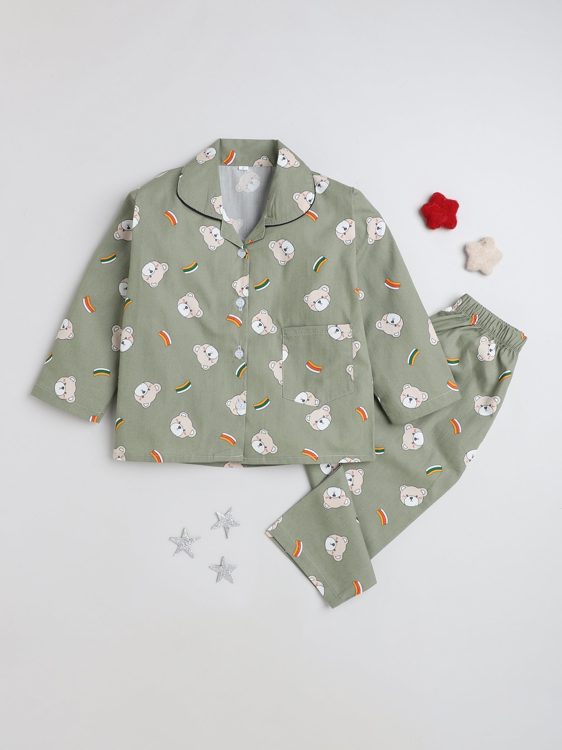 Full Sleeves Teddy Print Lounge Wear Night Suit Set For Kids Green