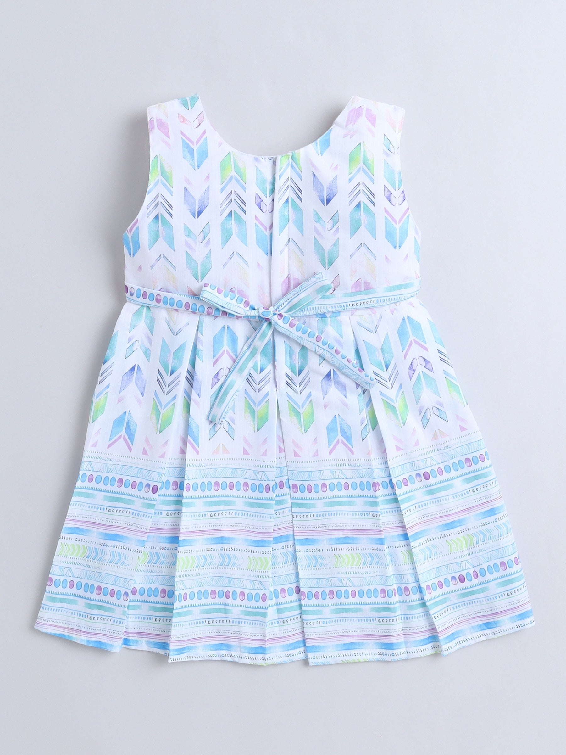 Geometric Printed Dress With Full Sleeves Floral Embroidered Jacket - Blue